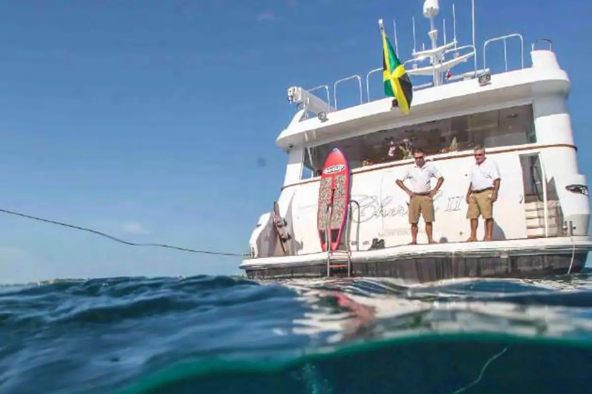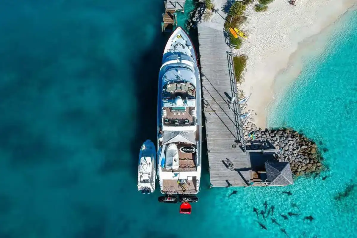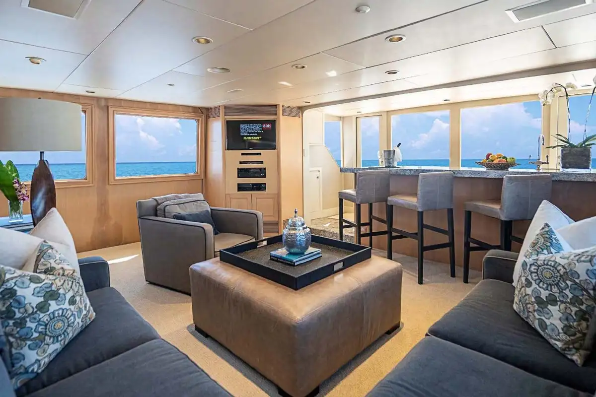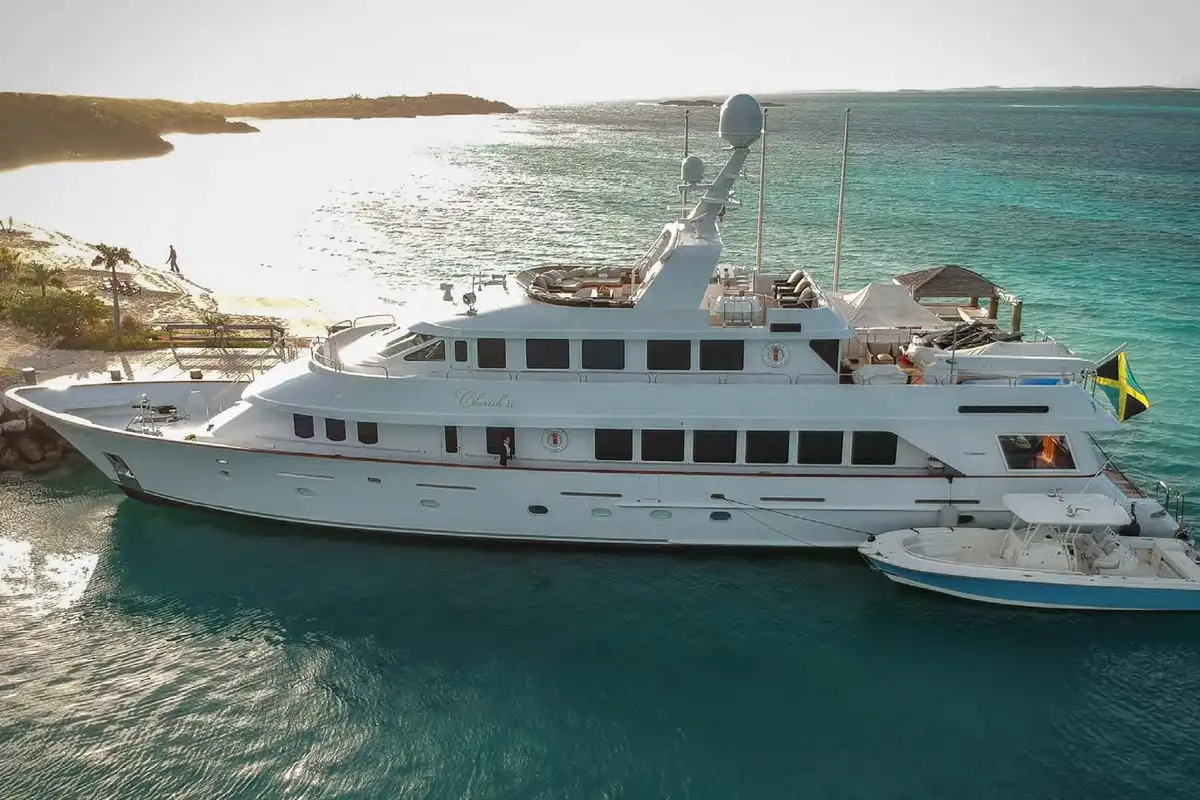 Venture up to the flybridge, where you’ll find an inviting Jacuzzi with built-in bar stools, a sun lounge, and a Bimini top, perfect for both sun-soaked and shaded relaxation. CHANSON accommodates up to 8 guests across 4 well-appointed staterooms. The on-deck VIP stateroom features large windows, a king bed, and an en-suite bath with shower. The full-beam master suite includes a king bed and private his-and-hers bathrooms, with a shower in one and a Jacuzzi in the other. Two additional guest cabins, each with spacious en-suite bathrooms, complete the accommodations—one with a full and twin bed, and the other with two twin beds. Beyond her elegant interior, CHANSON boasts an impressive range of water toys, including wave runners, Brownies third lung, and a fully rigged center console tender for endless adventure. With an experienced, energetic crew of six dedicated to providing an exceptional charter experience, CHANSON is your luxurious home on the water, ready to exceed your every expectation.