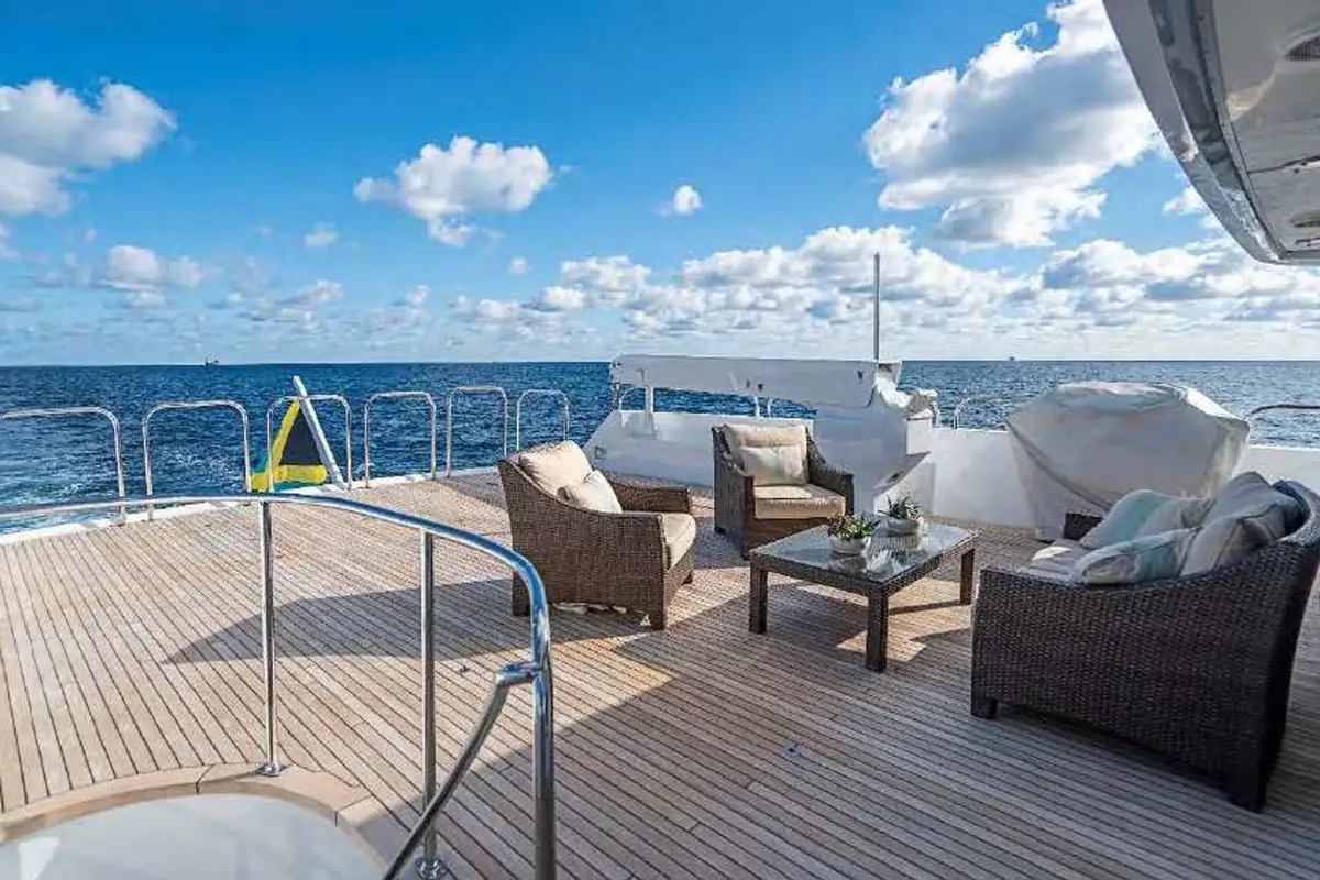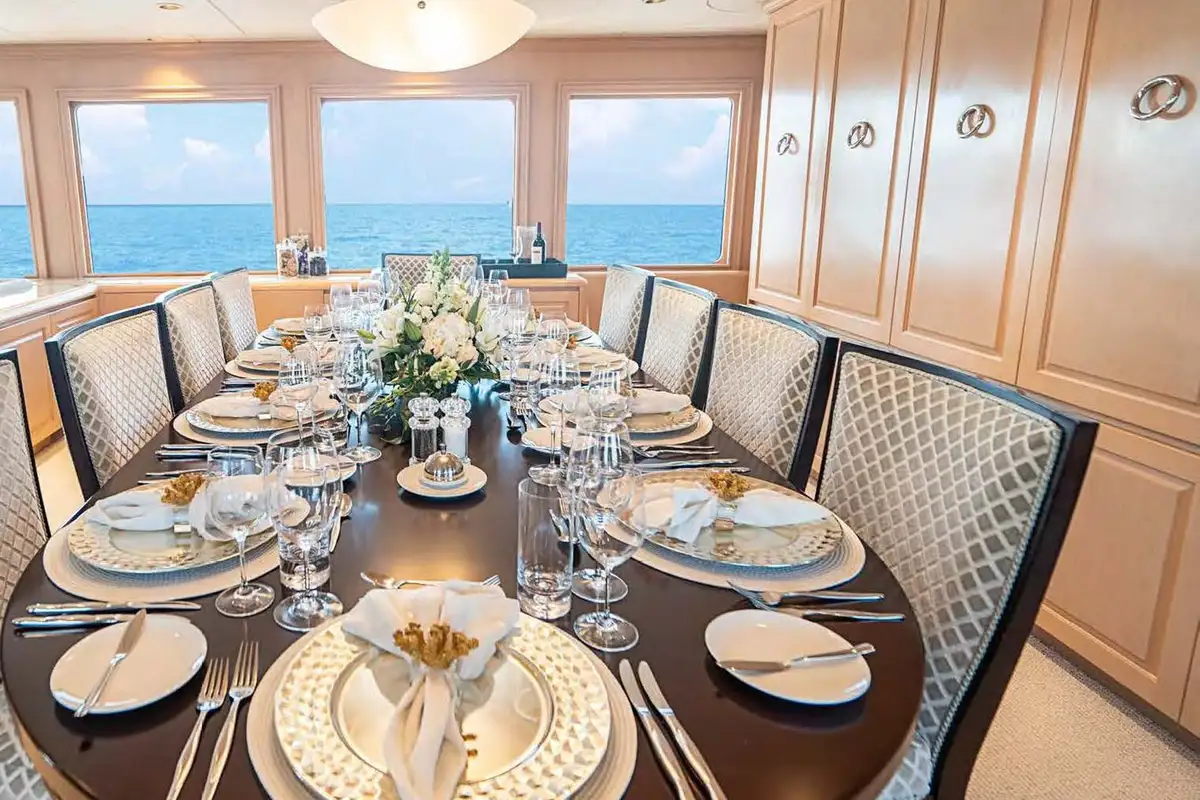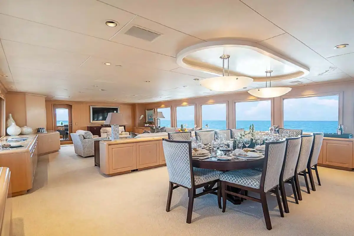 Welcome aboard CHANSON, where you and your loved ones can relax in unrivaled luxury and style. CHANSON’s spacious layout rivals that of a 140-foot yacht, offering an array of settings for both gathering and relaxation. On the aft deck, enjoy shaded al fresco dining, while the main salon and formal dining areas invite you into a light, airy space perfect for bringing everyone together. Above, the sky lounge offers a chic bar and entertainment space, leading out to the sundeck complete with cozy seating and even a golf putting green.