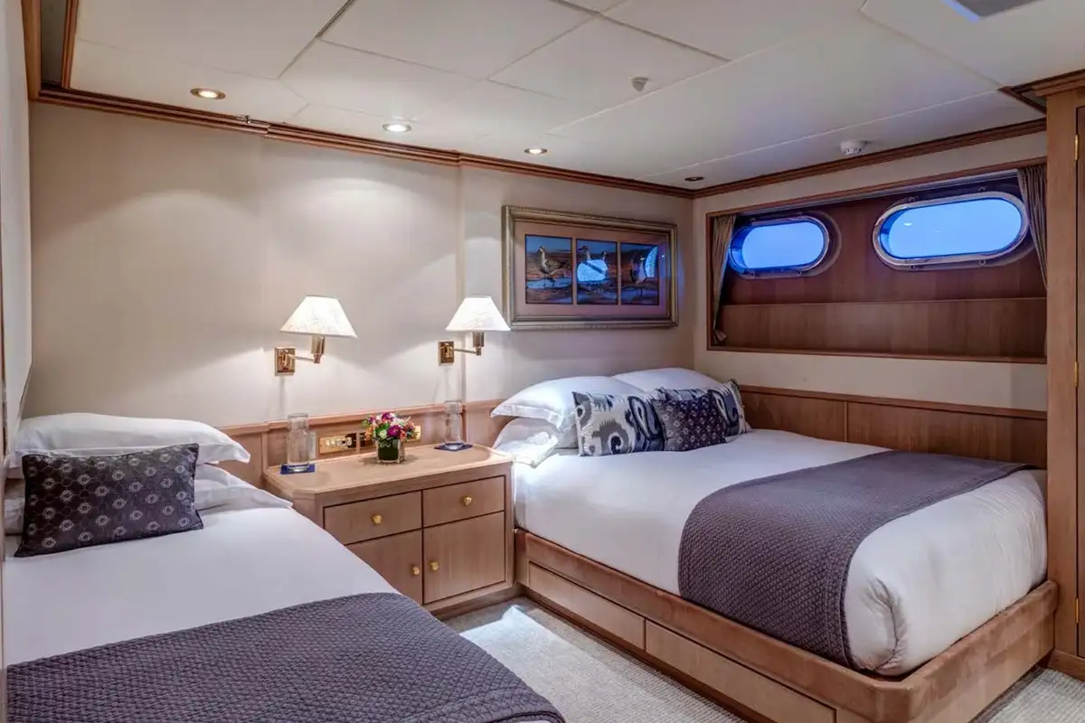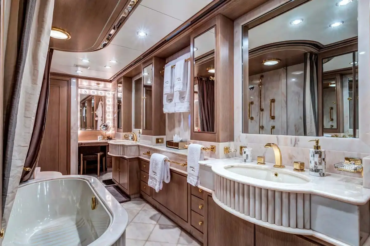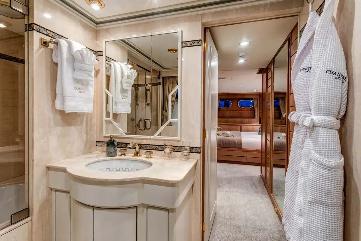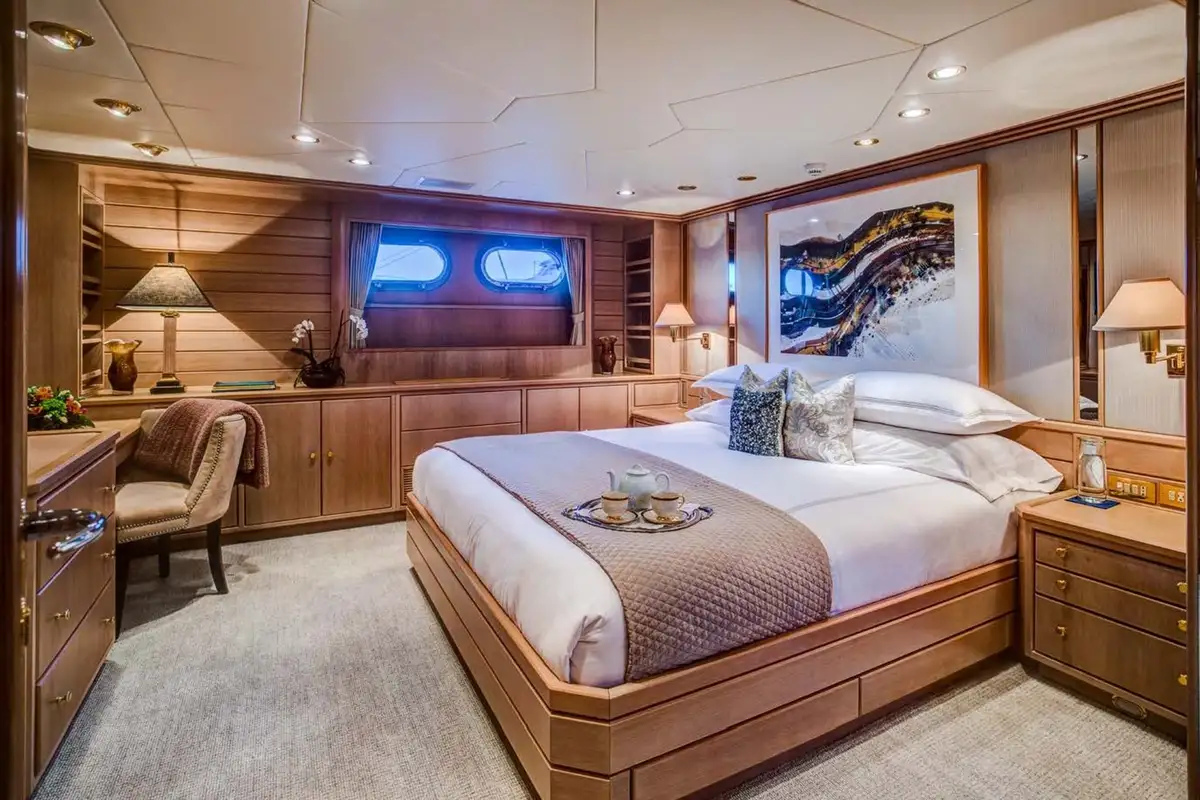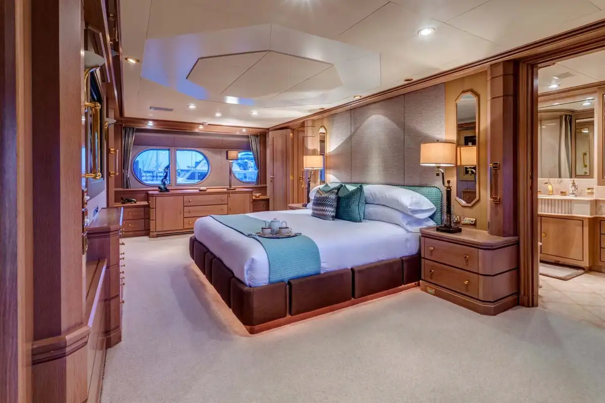 With living space for 12 guests, CHANTAL MA VIE gives you a full beam master suite made up of the cabin, his and her en suites with a full sized bath and a separate office. Situated forward on the main deck, this gives you peace and privacy. Your guests are accommodated in four double guest suites and a VIP suite on the lower deck, all generously sized.