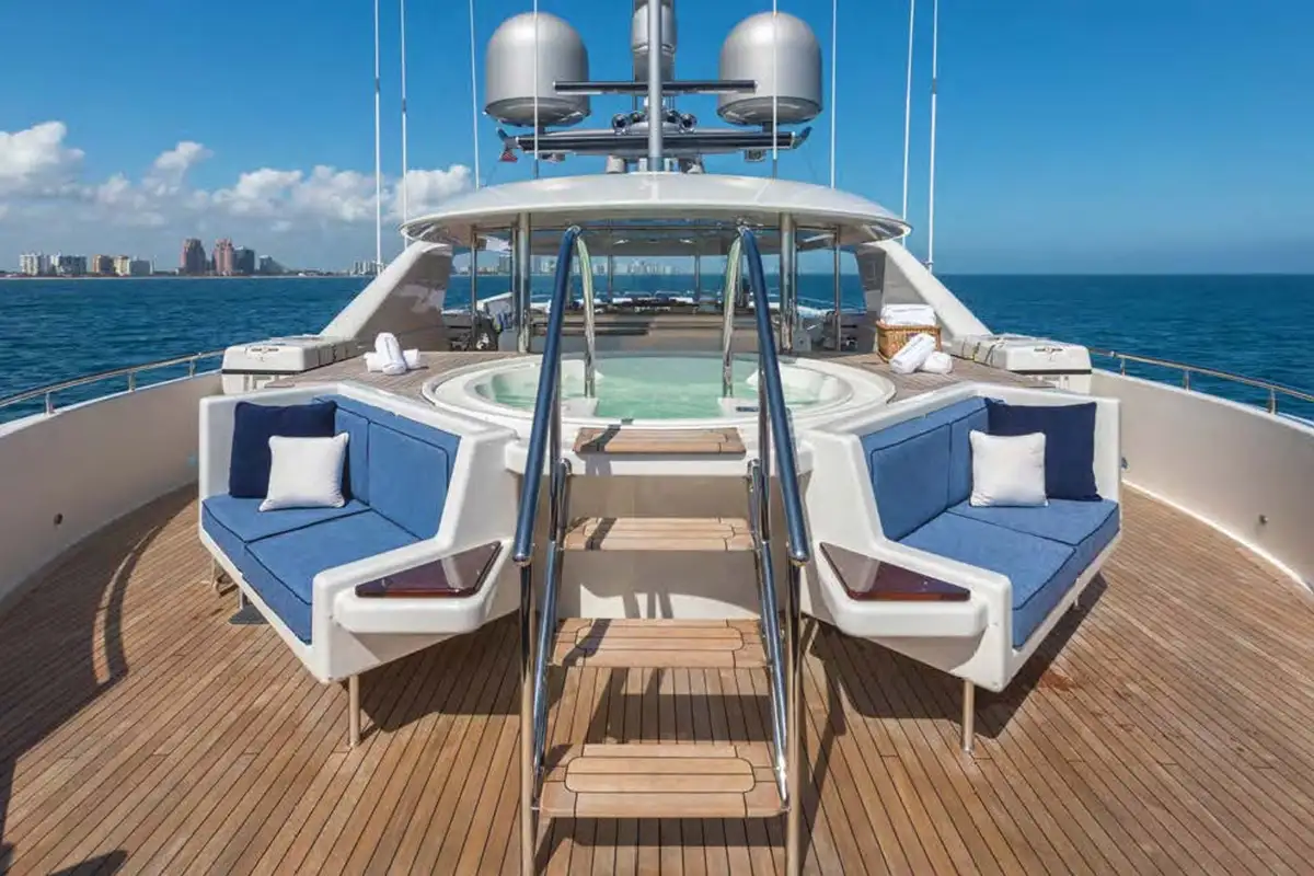 CHASING DAYLIGHT’s outdoor living spaces offer something for everyone with options for entertaining and relaxing in the sun or shade. The sundeck is the hub of the yacht providing guests with three hundred and sixty-degree views of the charter destination. Here guests can become sun-kissed on the sunpads, unwind in the Jacuzzi and enjoy a drink while socializing on the lounge area aft. Guests have the option of alfresco dining on the bridge deck aft and main deck aft. The main deck aft also has a charming lounge area perfect for a morning coffee or after-dinner drinks. A few steps down from the main deck aft is a swim platform where guests can jump in the water and enjoy charter yacht CHASING DAYLIGHT’s plethora of water toys.