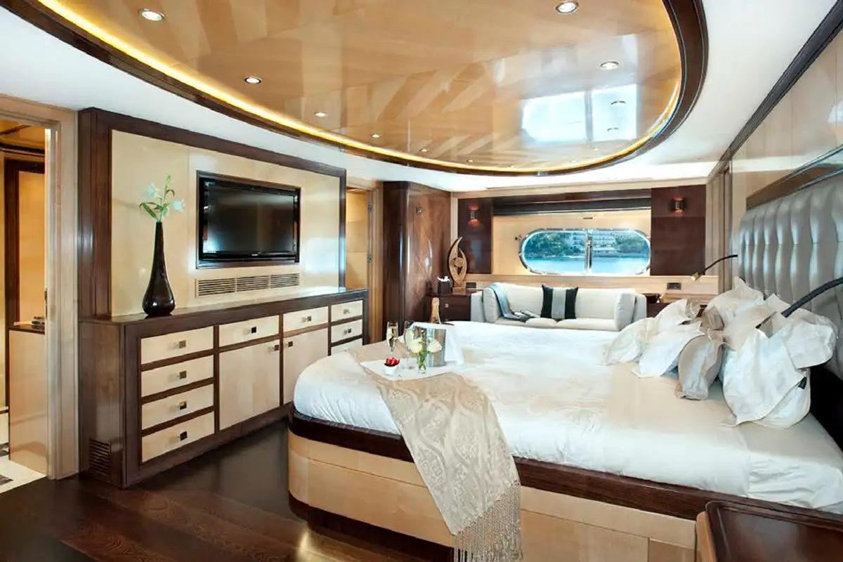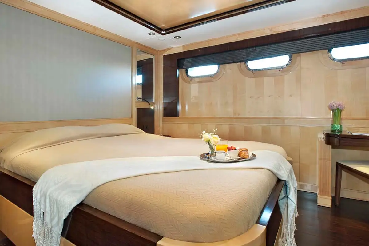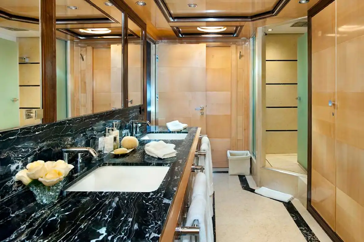 Her sense of grandeur continues from the main lounge forward to your master suite. A delightful space adorned with large hull windows to give you a real sense of place. There’s seating and a desk area, and of course, a palatial en suite bathroom with his and hers sinks.