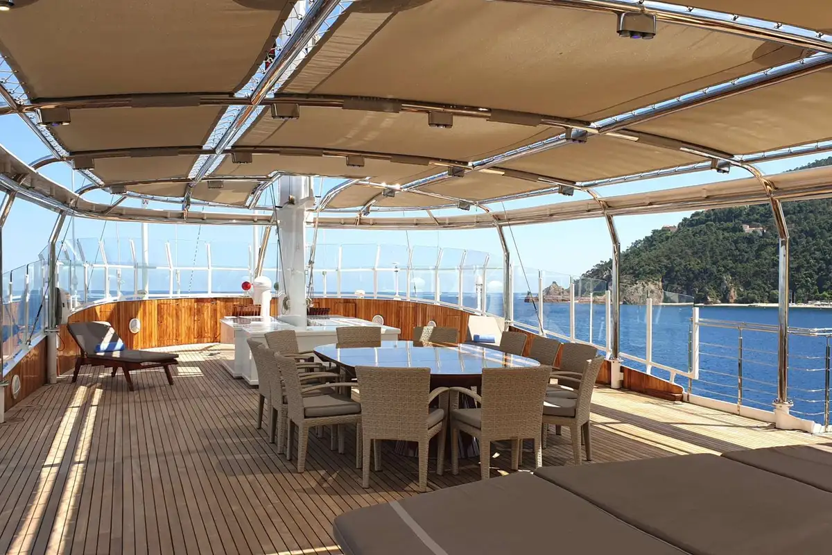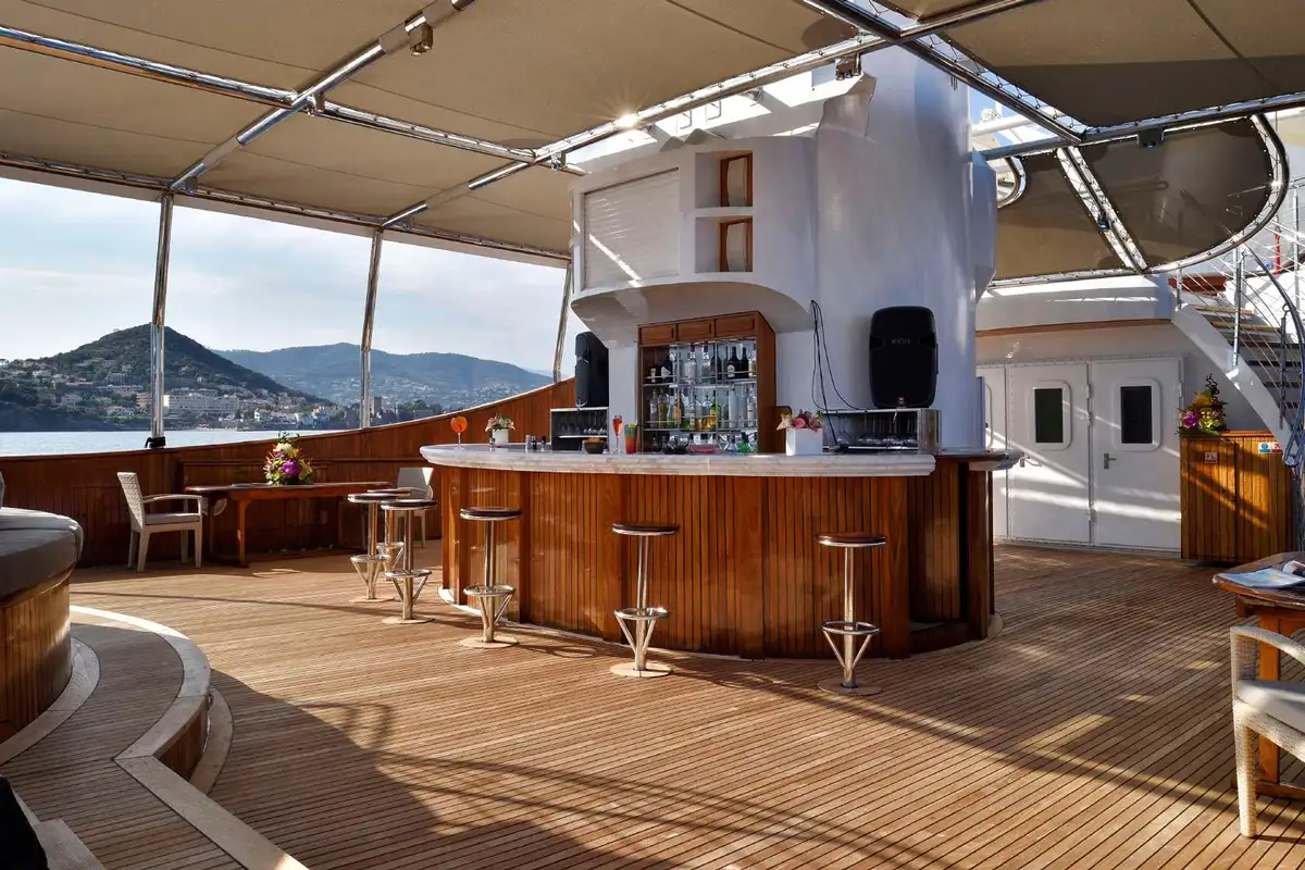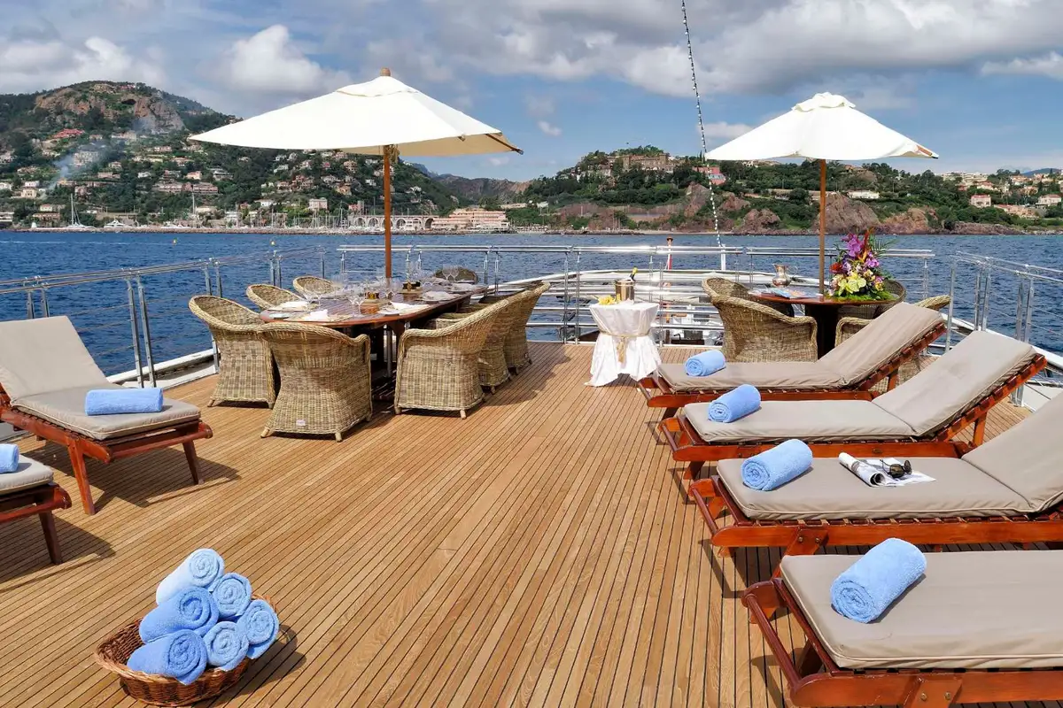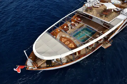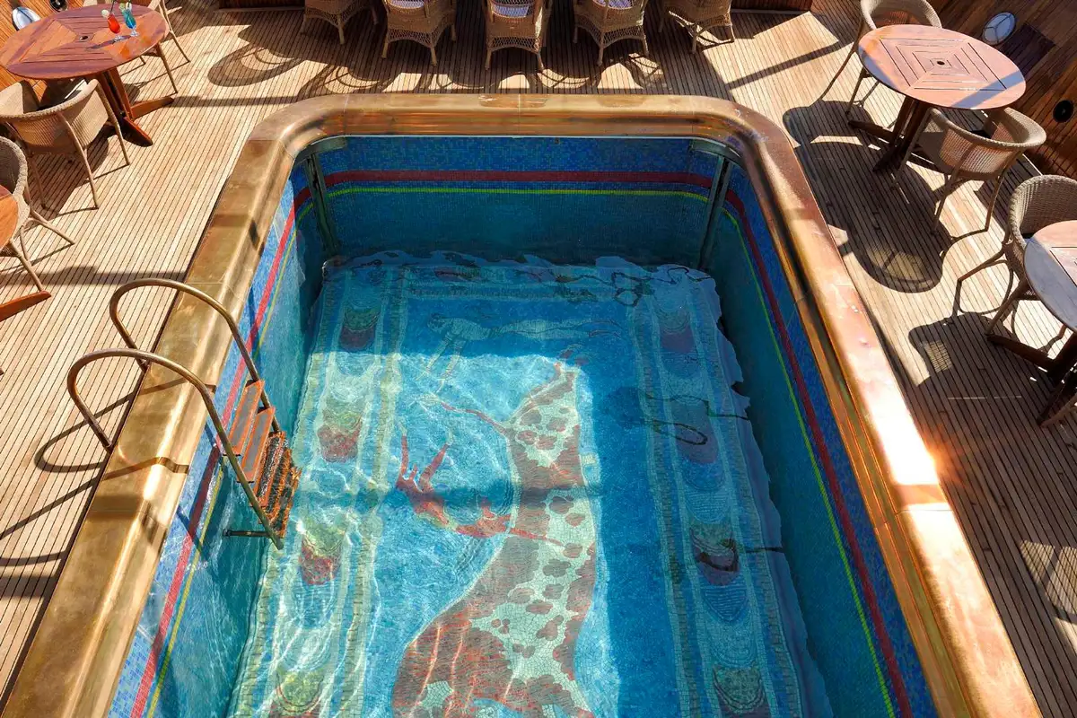 Steps lead down to the main deck aft with dining for 16 guests at a table with Ulysses themed marquetry inlays by Melinda Patten. Cafe tables and chairs surround the focus of this deck, a beautiful mosaic lined and bronze edged pool, the bottom of which rises to create a dancefloor for party evenings.