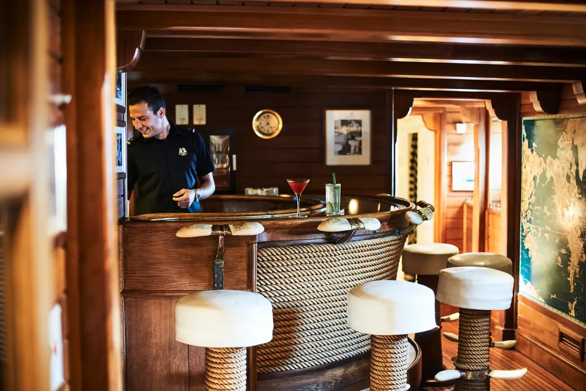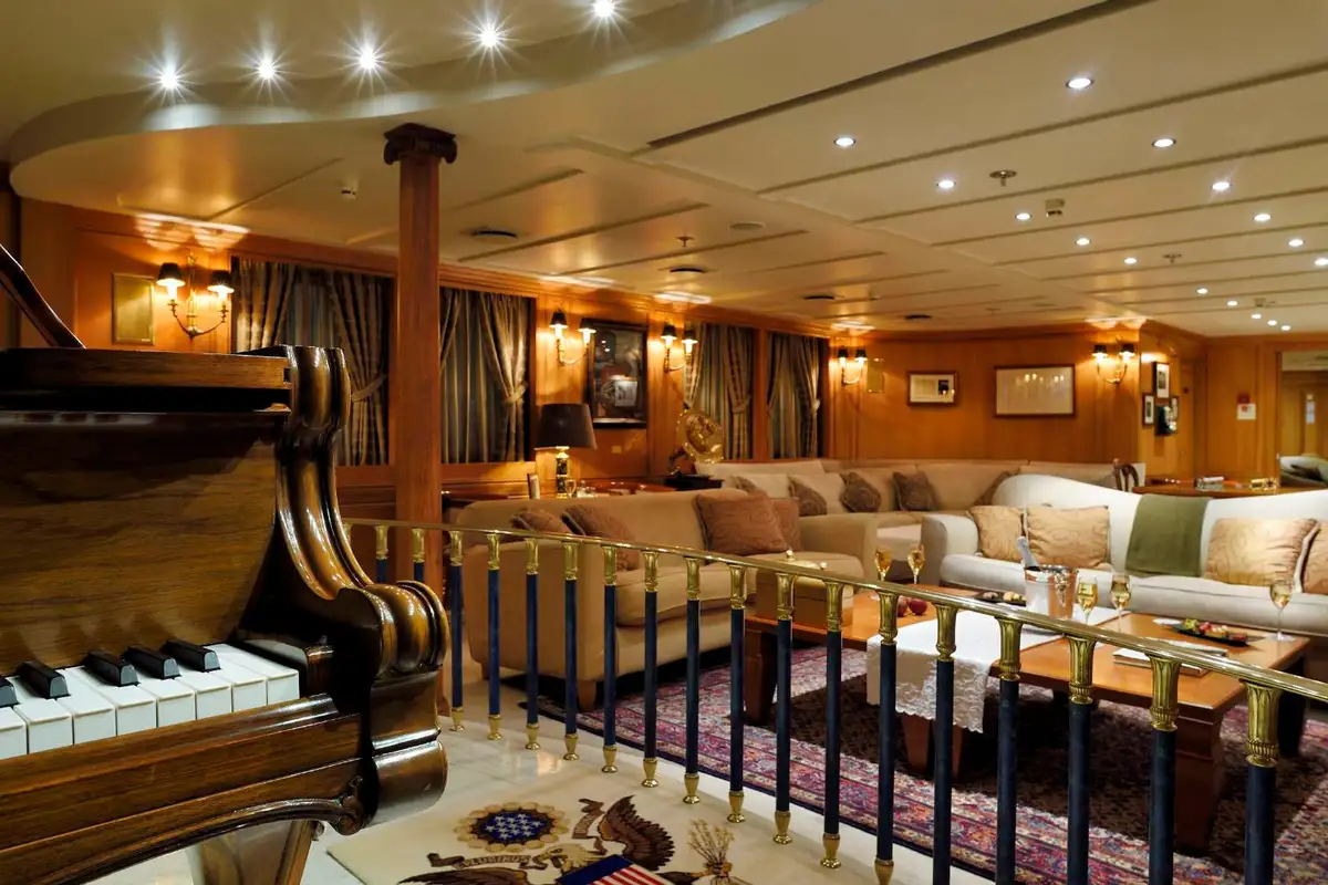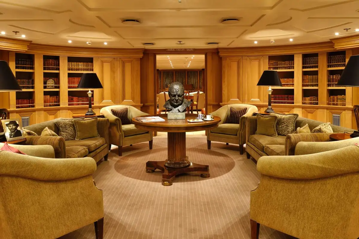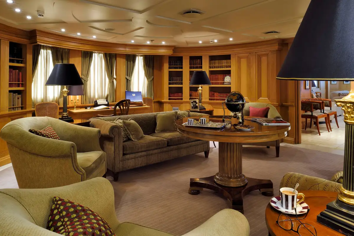 Inside on the main deck you can pick up a classic cocktail at the most famous bar afloat, Ari's, reputed to be built from the wreckage of a Spanish galleon and where JFK and Churchill first met in 1957. A few steps aft guests can live the lounge life with the self-playing piano in the Lapis Lounge, named after the fireplace's surround. After dinner for up to 42 guests, softly entertained by another Steinway, adjourn to the Callas Lounge with Steinway on stage, another incredible entertainment space.