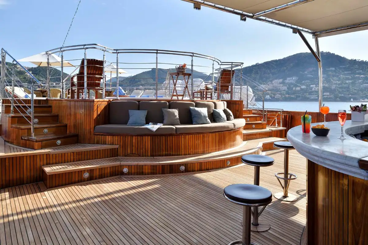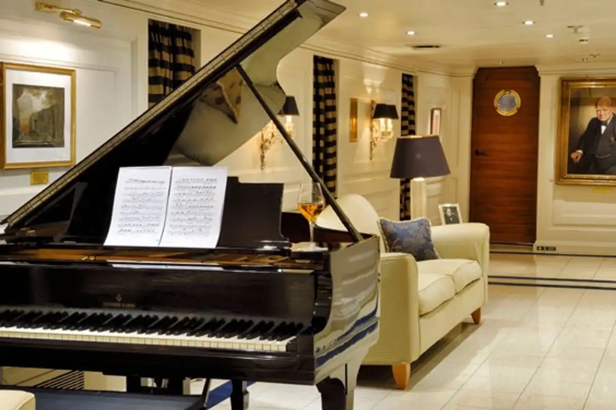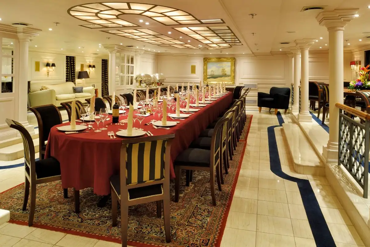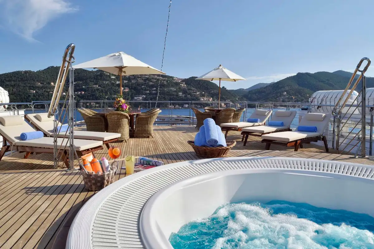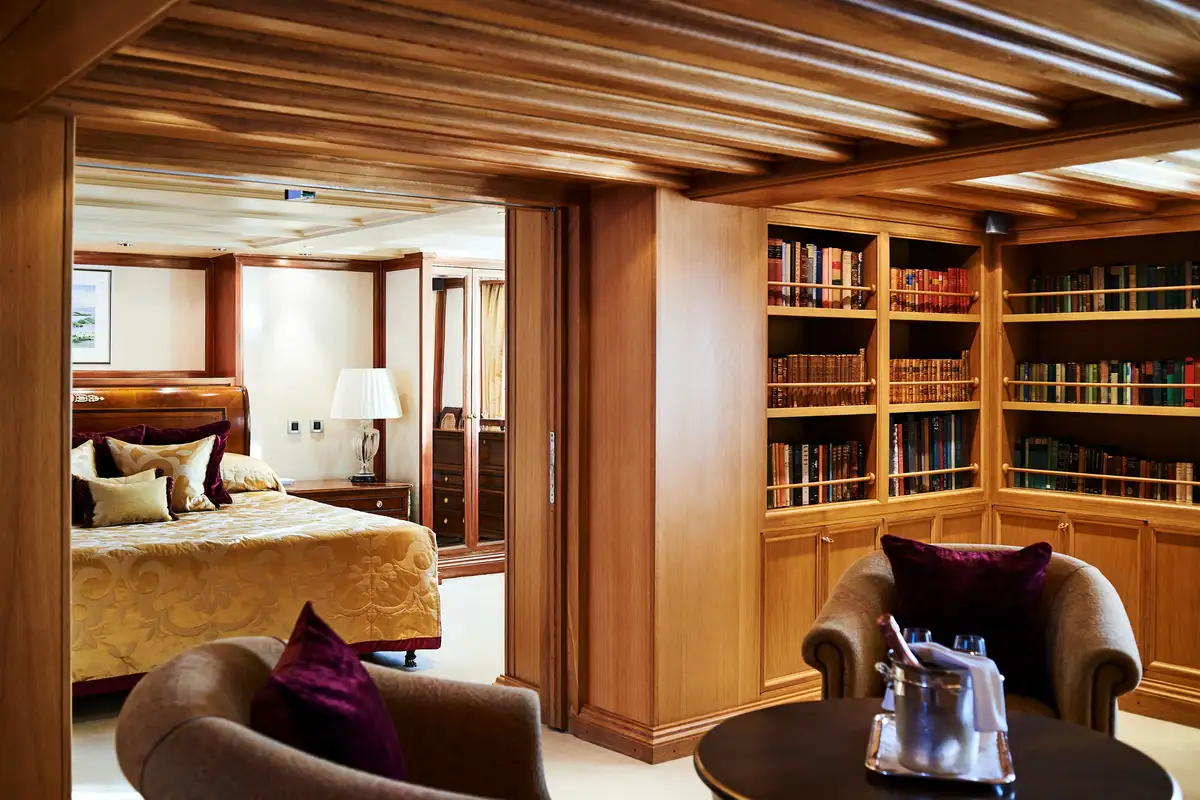 Inside on the main deck you can pick up a classic cocktail at the most famous bar afloat, Ari's, reputed to be built from the wreckage of a Spanish galleon and where JFK and Churchill first met in 1957. A few steps aft guests can live the lounge life with the self-playing piano in the Lapis Lounge, named after the fireplace's surround. After dinner for up to 42 guests, softly entertained by another Steinway, adjourn to the Callas Lounge with Steinway on stage, another incredible entertainment space.