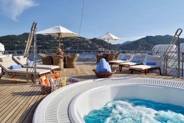 Get the best views from the uppermost compass deck as you relax on sculpted sunloungers. Curved steps lead down to the promenade deck aft. Pick up a cocktail from the bar then take a dip in the jacuzzi, lie back and watch the world go by or stroll around the sidedecks.
