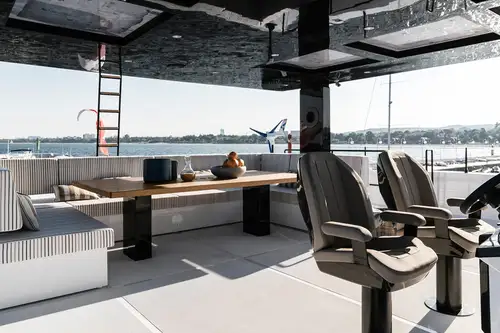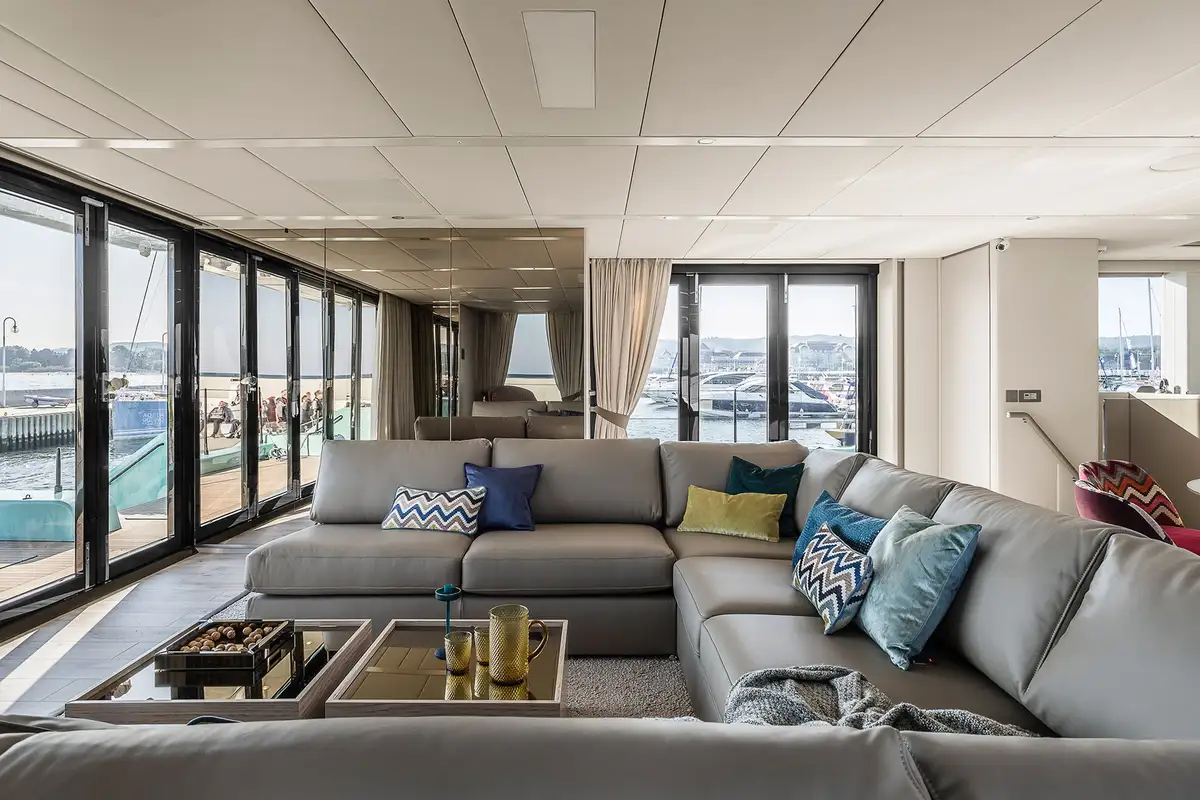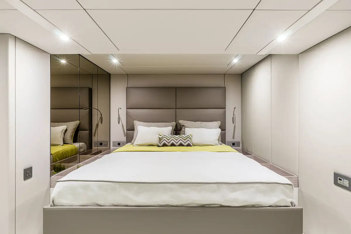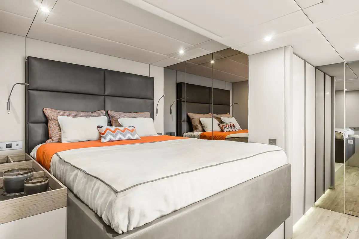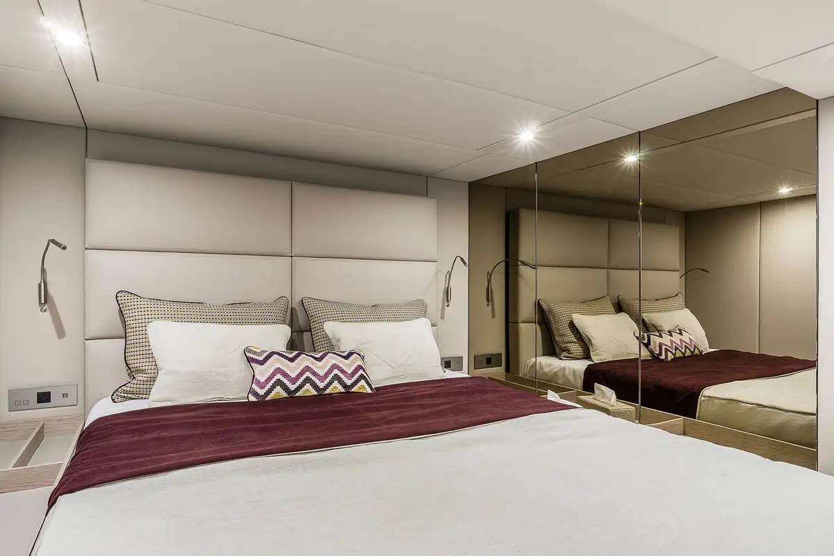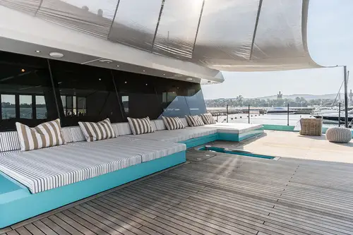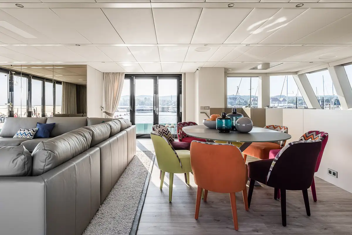 Offering 300 m2 of living space, CHRISTINA TOO can accommodate up to eight guests offering one master and one VIP suites with generous quartz-clad bathrooms and two guest cabins. Her vast main deck featuring a full beam galley and saloon was given a bright custom décor combining grey and cream tones with contrasting colorful furniture.