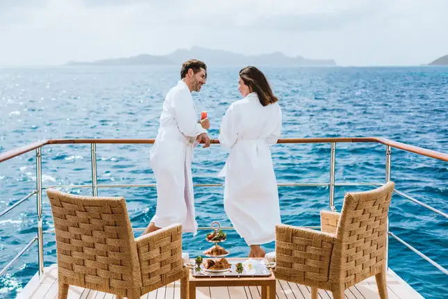 Designed for ultimate comfort, her highly sought-after layout accommodates up to 12 guests in seven cabins. The full-beam master suite, located on the main deck, has a private balcony – perfect for savouring your morning coffee or watching idyllic sunsets. On the upper deck, there is a VIP suite along with a single cabin and three double guest cabins, with one twin cabin on the lower deck completing her versatile accommodation.