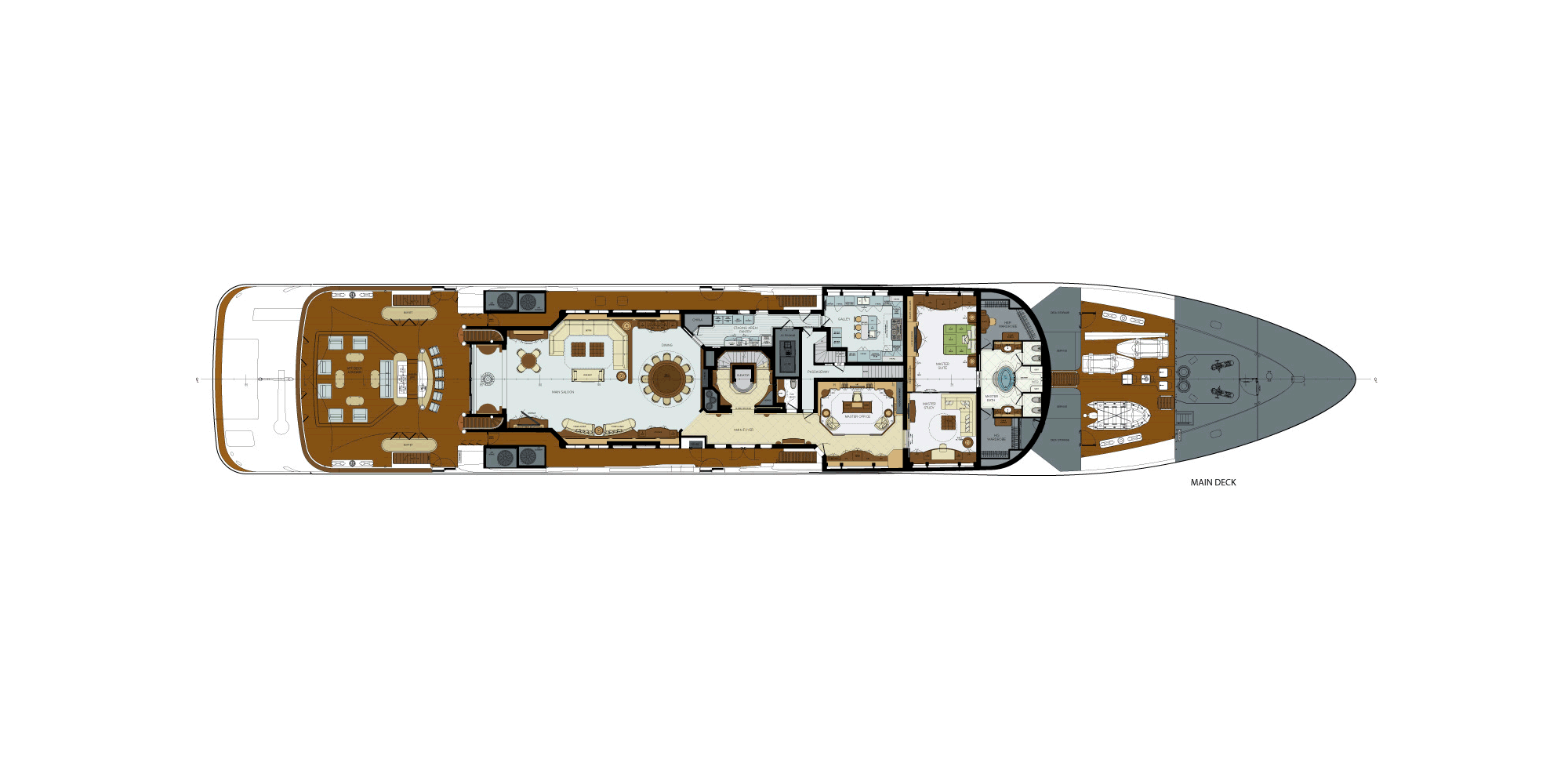 When it’s time to retire, the master suite is located on the main deck and has a separate lounge area and his and hers bathrooms. For those retiring to the lower deck there is an elevator on board leading guests down to four double cabins and two twin cabins.