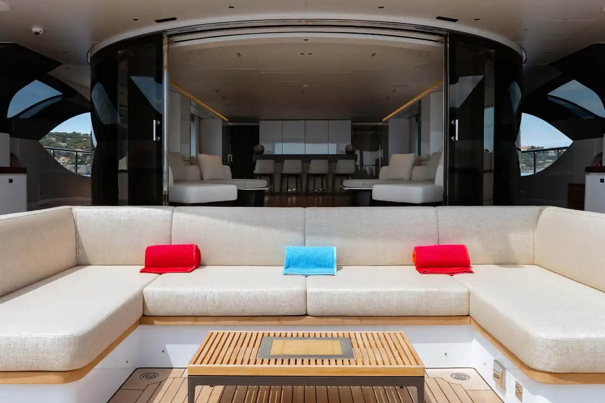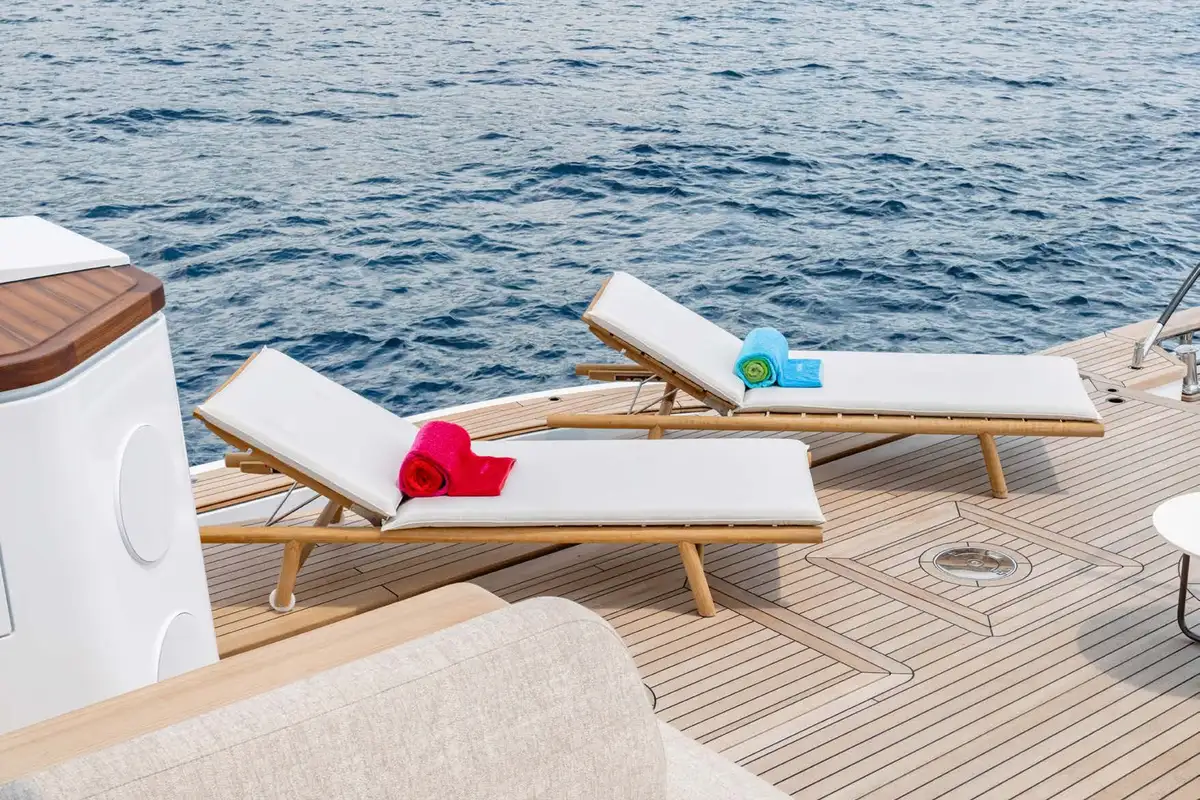 - Fold down platforms creating a "beach club" aft