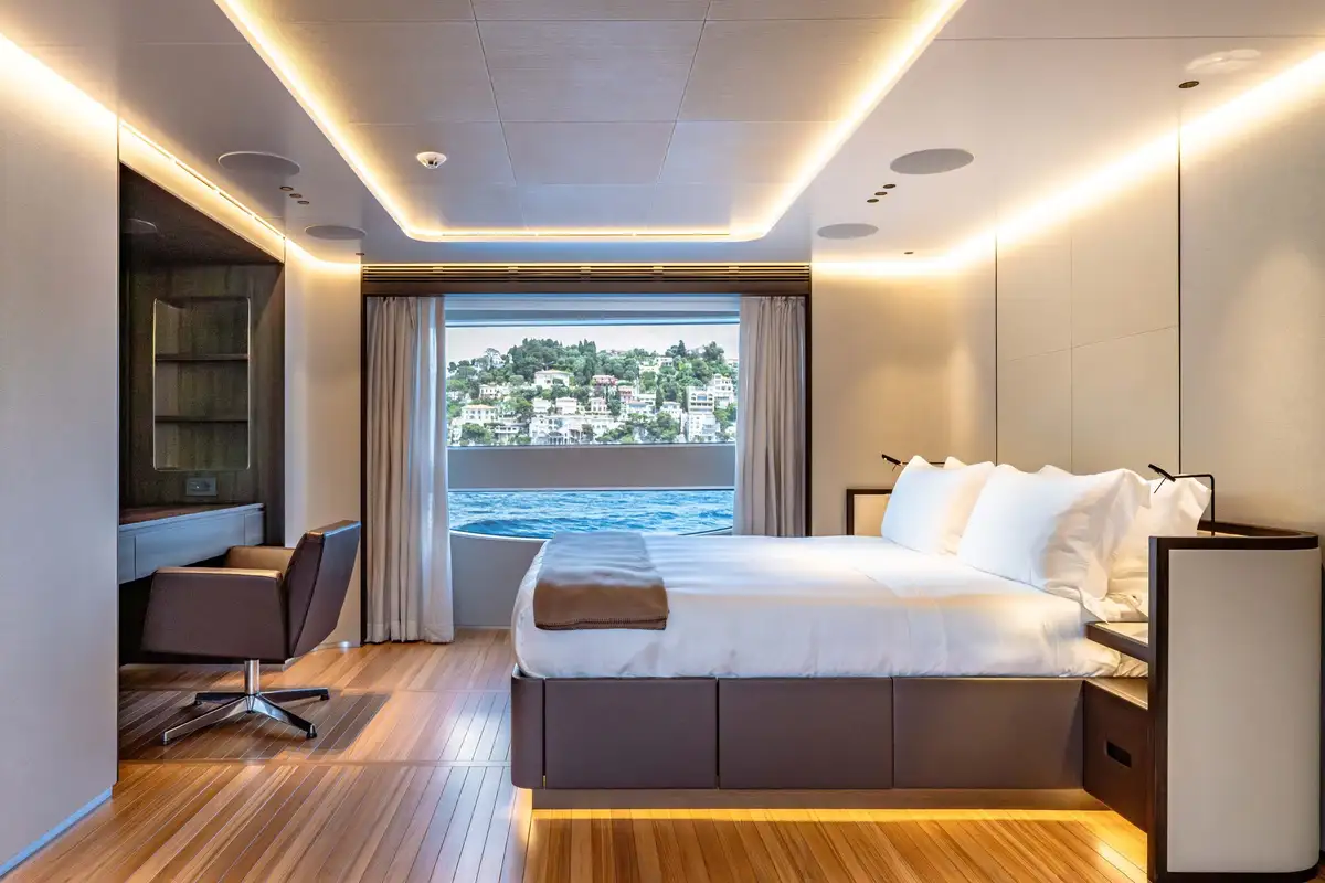 The main deck aft is your private beach club, a mezzanine terrace which opens out and expands when the anchor goes down. There’s a glass-fronted pool just above sea level, lounge and dining areas in sun and shade, oodles of sunpads and sun loungers, a huge bathing platform and a seamless flow into the main deck lounge, which is a serene and comfortable retreat from the the action and fun outside.