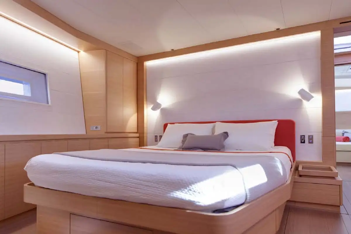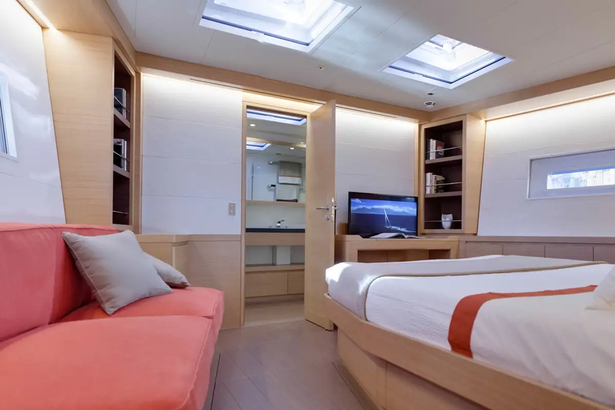 For greater privacy, intimacy or more formal dining occasions, inside CROSSBOW there’s a beautiful raised saloon. Styled with bleached oak, and with walnut and stainless-steel detailing, the saloon has 270 degrees of windows to give you and your guests a space flooded with natural light that offers amazing views. Her modern contemporary interior design is finished with off-white and coral red furnishings creating a lovely chic setting to enjoy. Opposite the dining area, to starboard, is a beautiful lounge area. Relaxing on the sofas, eye-level hull windows provide views for children and adults alike.