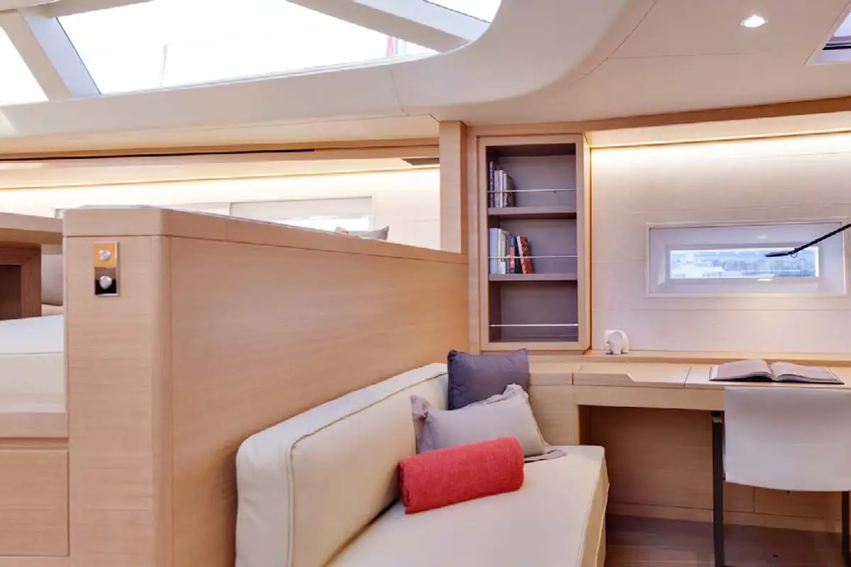 Ahead of the saloon is a convenient office space, again, a hull window to provide a stunning vista to enjoy from your desk. Opposite the charming office is a double guest suite with an en suite bathroom and a separate shower compartment. Ahead of this, and taking up most of CROSSBOWS forward volume, is the delightful master suite. With built-in sofa seating to port, and a desk area to starboard you’ll have your private space to savour. Ahead of your suite is your private bathroom with en suite facilities and a separate shower compartment