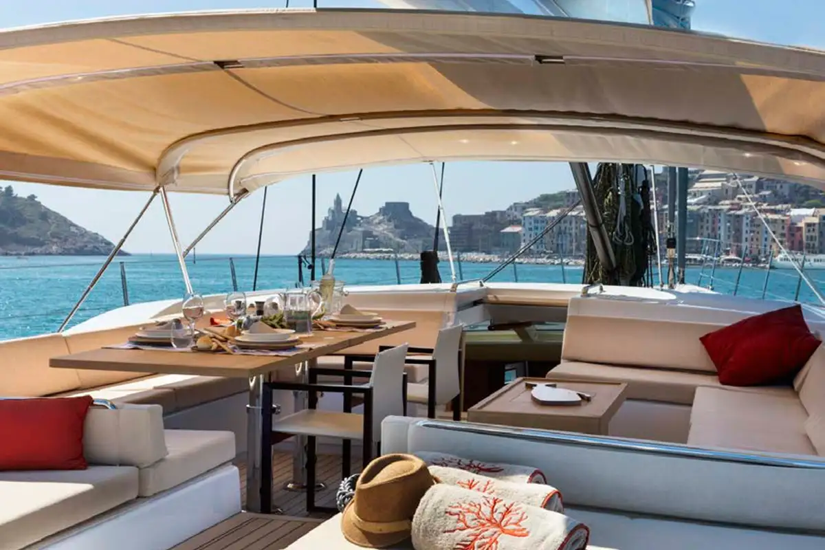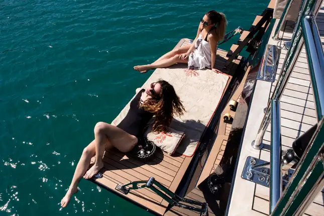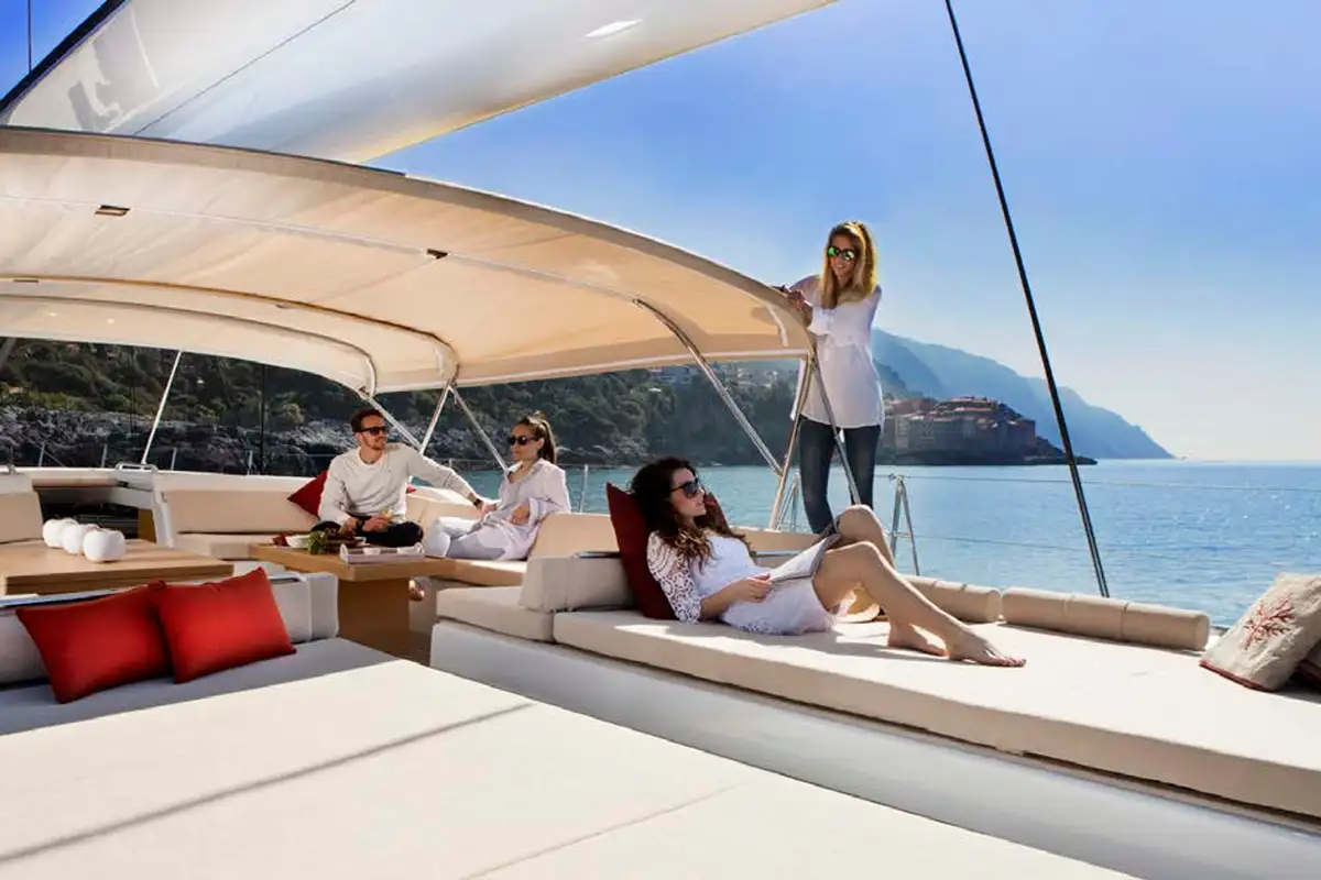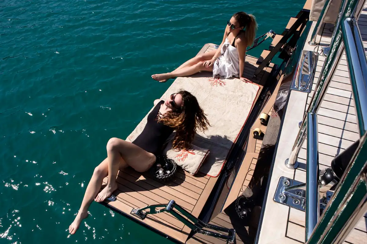 With so much deck space available finding somewhere to relax is never a problem. The spacious guest cockpit is the social hub on deck. Here you can enjoy al fresco breakfasts, elevenses, lunches or dinners. You can rest in the shade, or on the vast rear sunpads and take time out from on-water activities like snorkelling paddleboarding, canoeing or being towed at speed on skis, a wakeboard, a kneeboard or inflatables.
