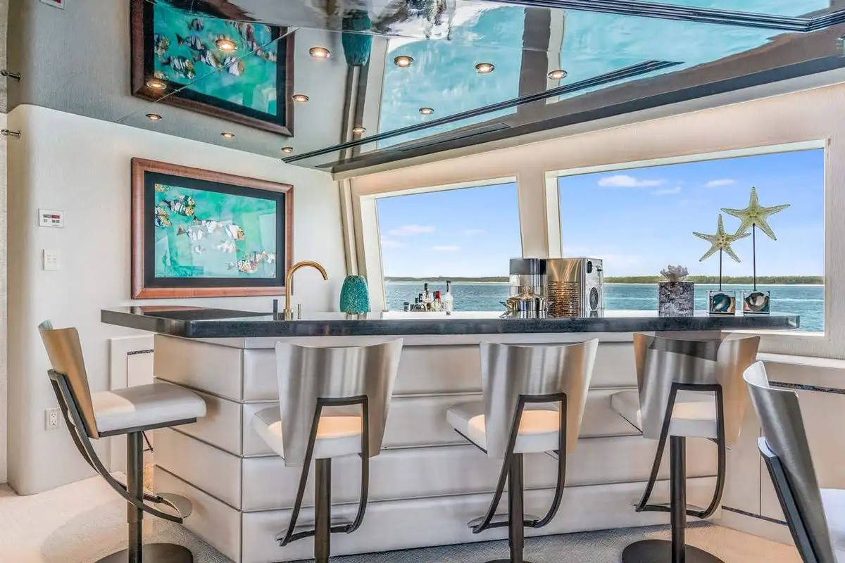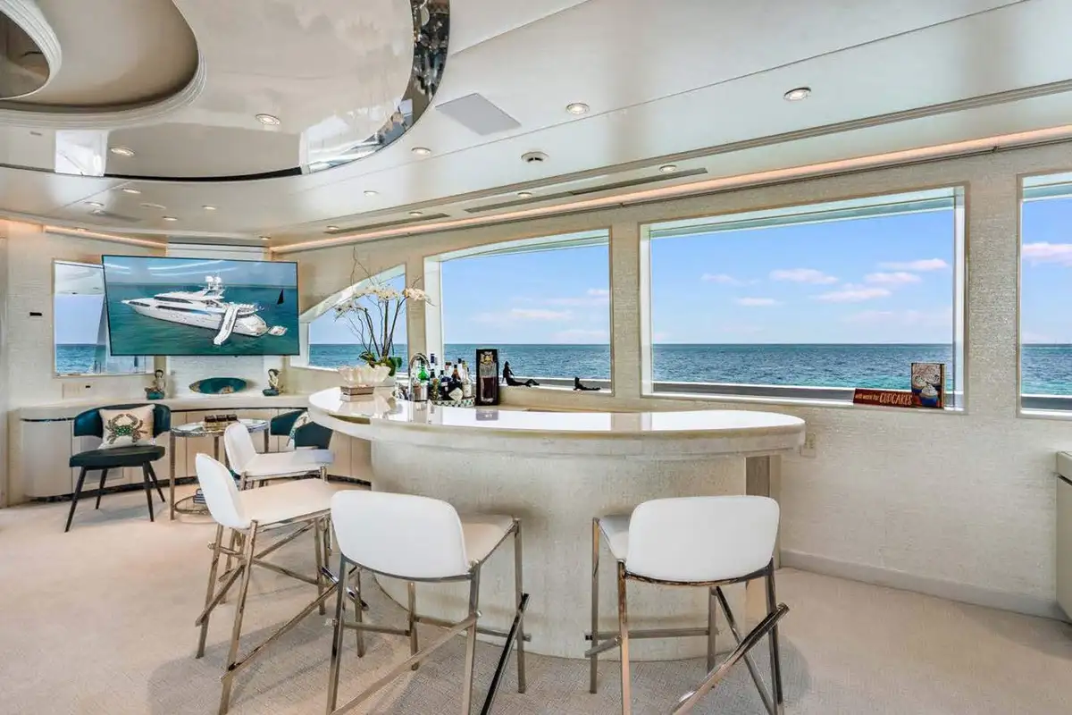 The main deck saloon has an elegant vibe and it’s beautifully bright with big windows along both sides. There’s a cocktail bar in here as well as a sociable lounge and a 10-seat table for fine dinning when you choose to spend the evening on board. The skylounge above it has another full bar plus a spacious lounge and a custom blackjack table.