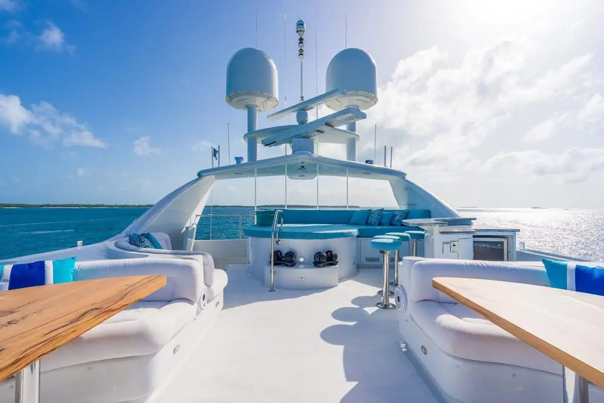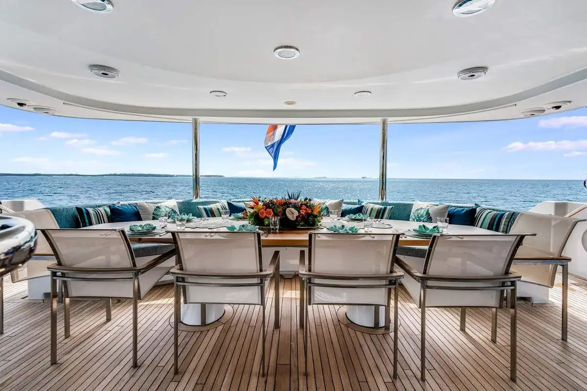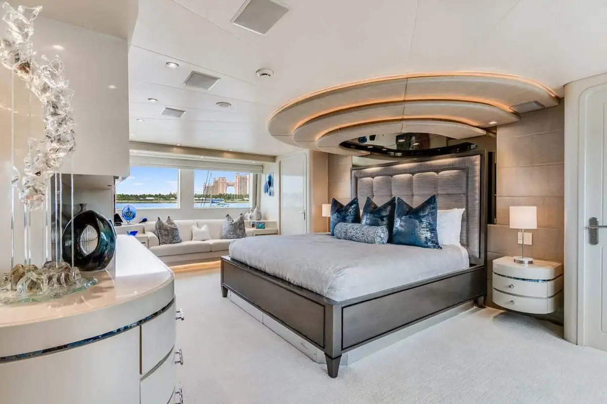 The sundeck has a lot of space with a bar and several lounging areas plus a large, elevated day bed with a jacuzzi pool. It’s a versatile layout that allows groups of guests to gather together or do their own thing, according to their mood. Her main deck aft is an excellent open-air dining space which includes a sit-up bar, and it’s just a few steps down to the bathing platform when you fancy a dip in the sea. When the anchor goes down and the toys are deployed, the boat deck is another big open space with plenty of sun loungers.