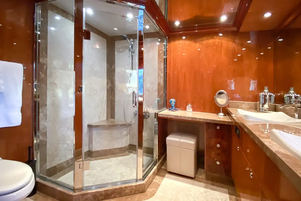 Your comfort and convenience on board are assured with full air conditioning and wi-fi internet throughout, plus stabilisers to smooth her motion at sea. Her layout is versatile, ideal for two couples with kids or without. There’s one master cabin on the main deck and another down below, both with good views of the sea. The other two guest cabins are convertible doubles and all have their own private bathrooms.