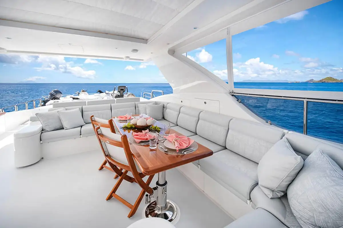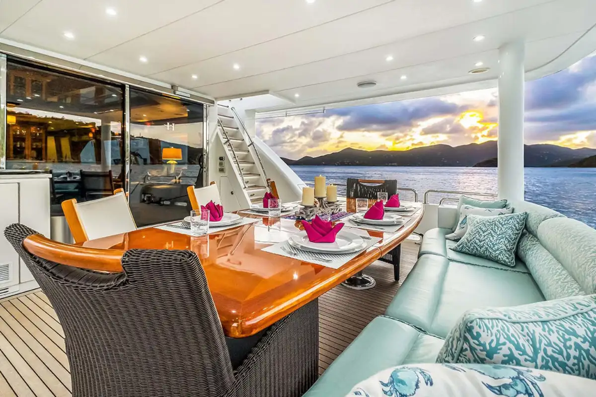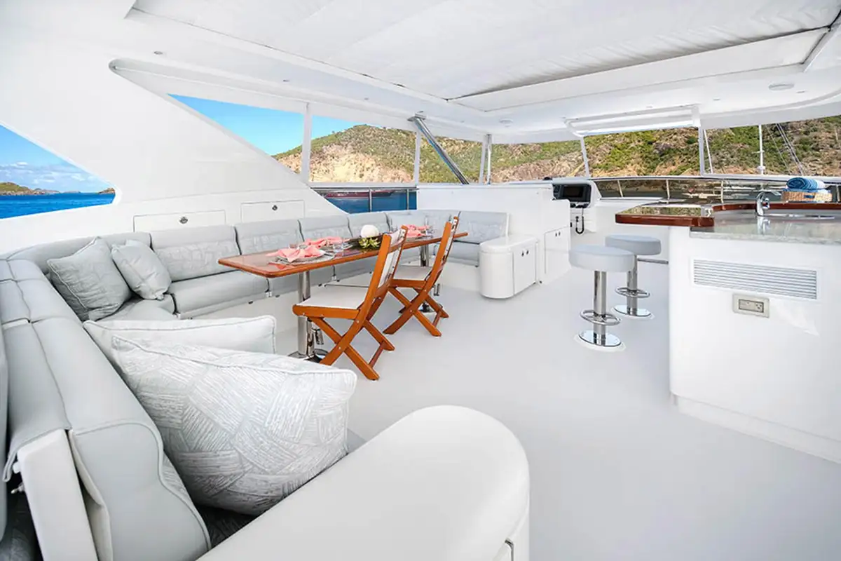 The main deck saloon is an open plan space the flows out into the large aft cockpit. There’s a sociable lounge with eight seats and an elegant formal dining area in the saloon, and another large table for dining or relaxing outside. And when you want a little time alone, there’s a secluded seating area on the bow.