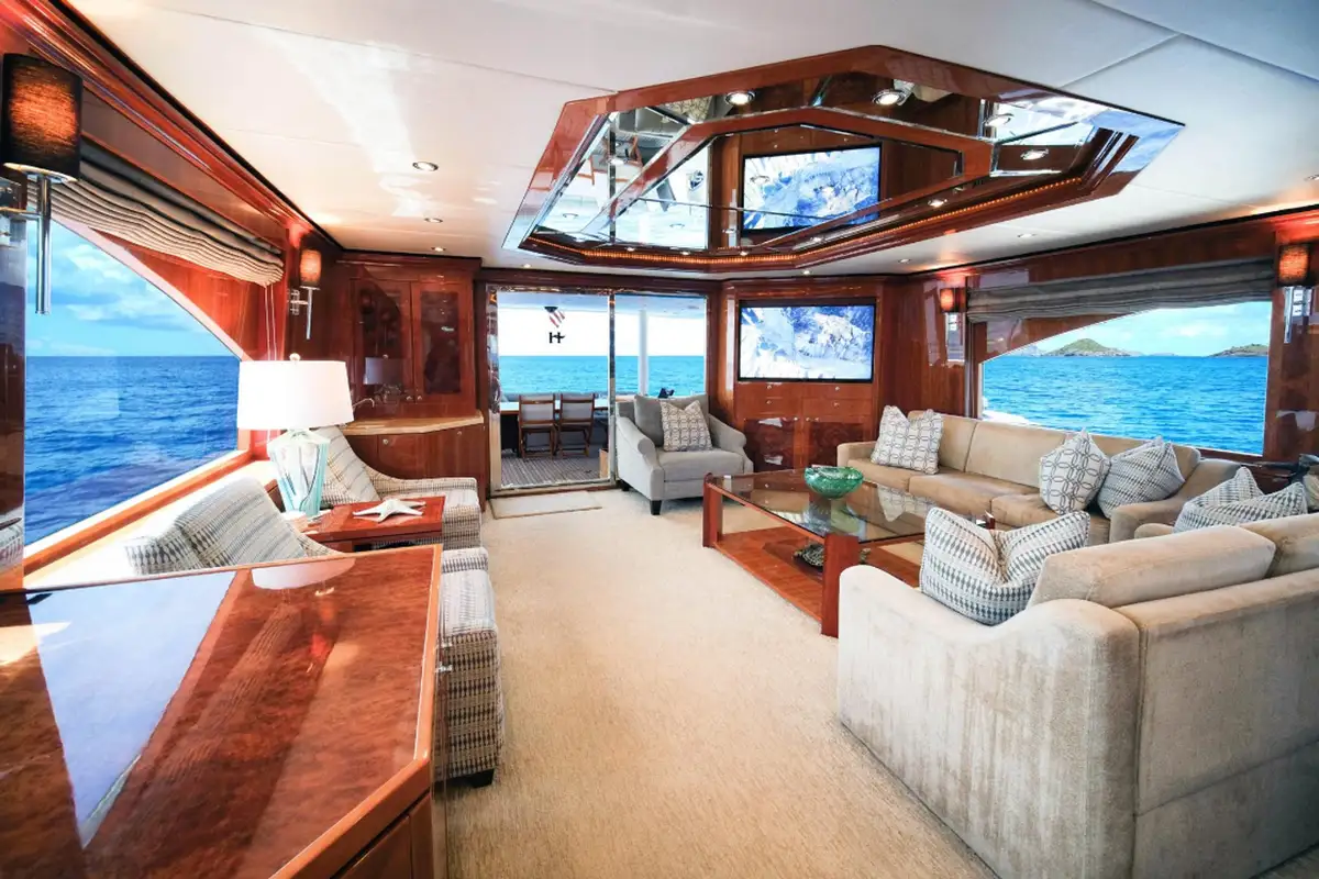 Up on the sundeck there’s a jacuzzi with sunpads as well as a large horseshoe seating area with a convertible coffee/dining table and a bar with four stools, so she’s perfect for a party and ideal for tranquil relaxation – whatever suits your mood. With a hardtop over the forward part and an open deck astern, there’s a variety of sitting and lounging spots in both sun and shade.