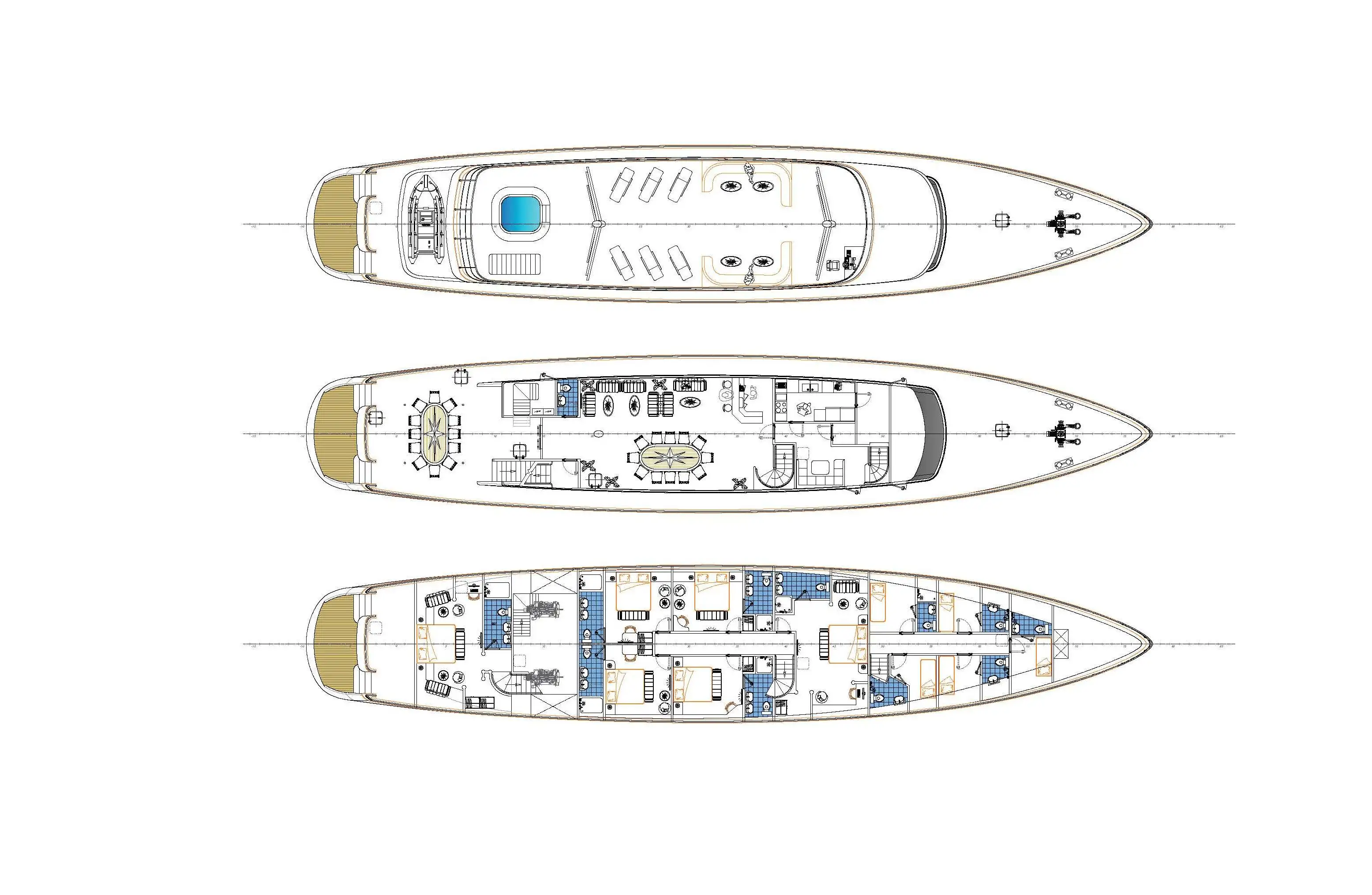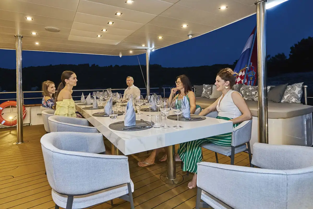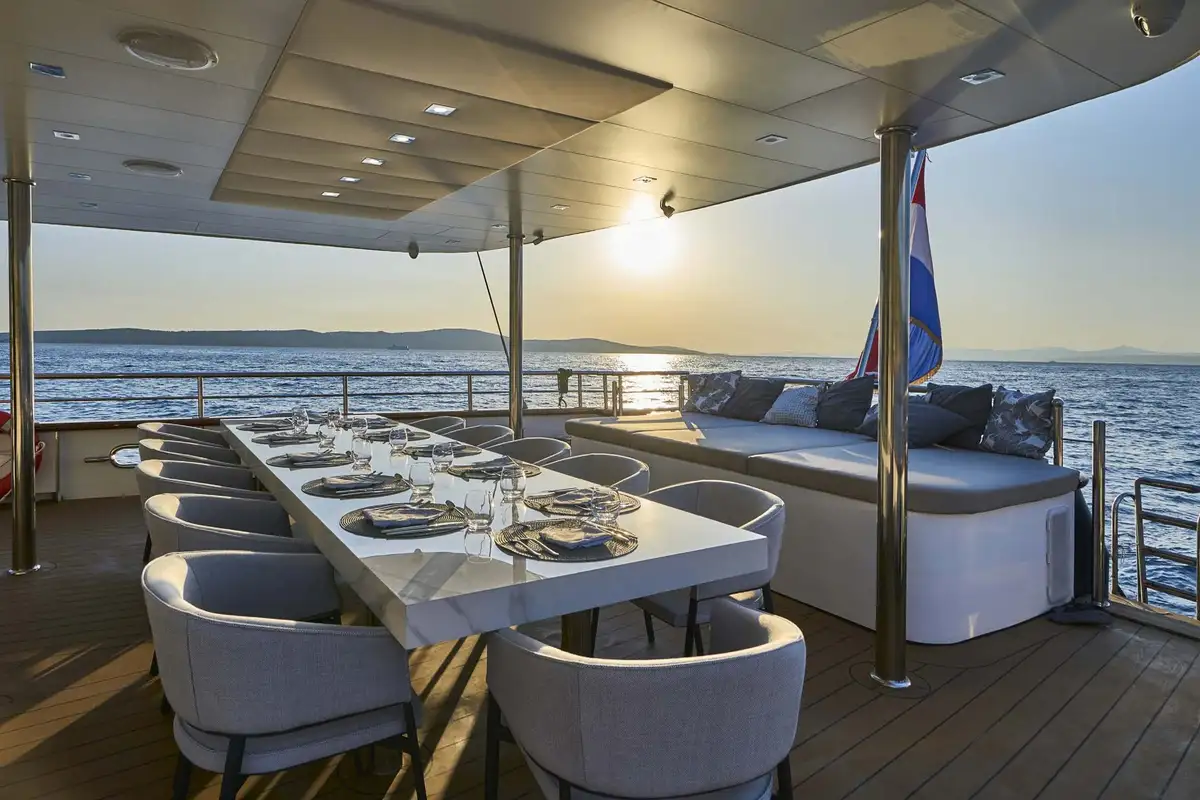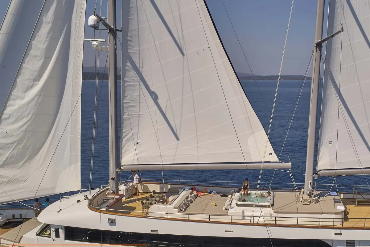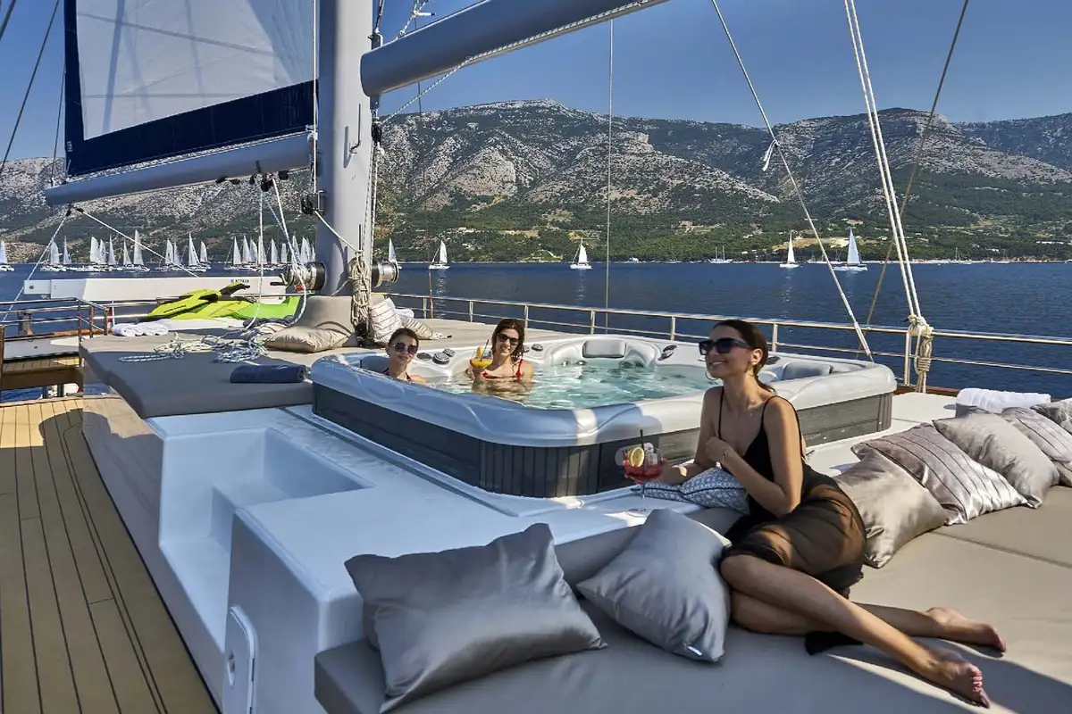 Designed and purpose-built to cruise the lovely islands and mainland coasts of the Adriatic, DALMATINO is exceptionally spacious for a 44-metre sailing vessel. She has an excellent variety of outside spaces for relaxing, dining, lounging and partying, with plenty of seats and day beds in full sun and others in deep, cool shade. There’s a large jacuzzi on the sundeck where you’ll also find two separate sunbathing areas and a sociable lounge with a bar.