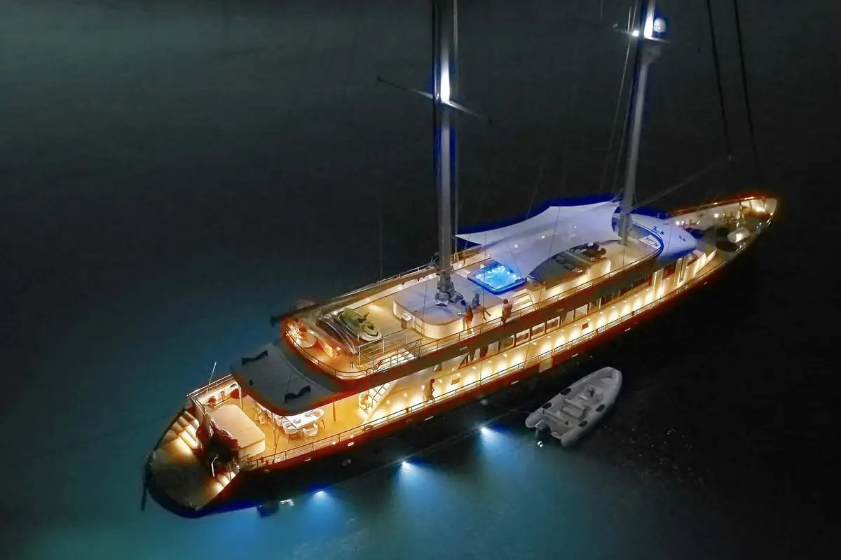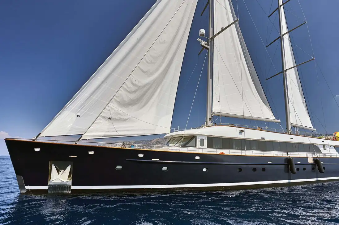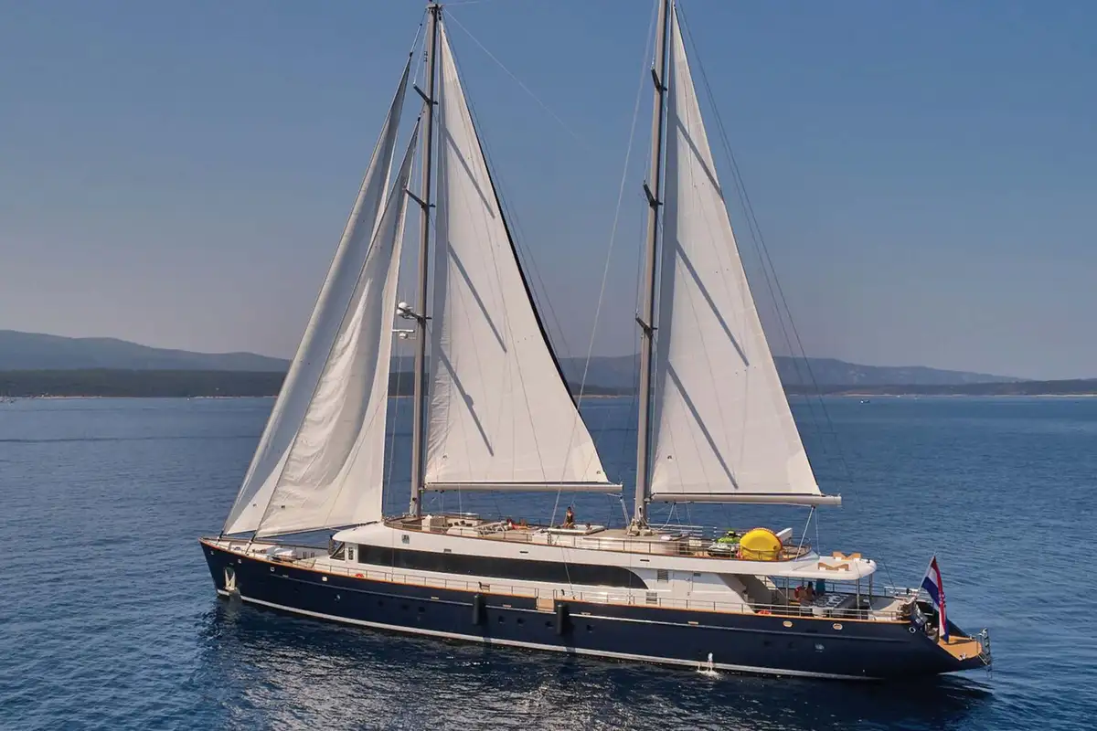 If you’re looking for a sailing yacht that offers the same amount of living space as a large motor yacht, DALMATINO fulfils that brief. She’s a modern two-masted schooner with a smart exterior look, a huge main deck lounge, a vast sundeck and six en suite cabins for up to 12 guests, including a spacious master suite and a VIP double. High-quality service can be expected from her eight-strong professional crew.