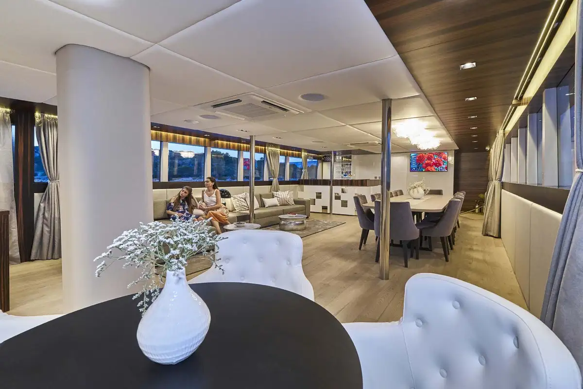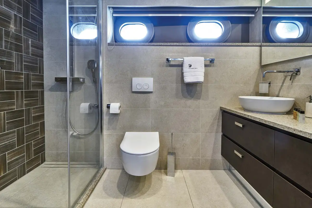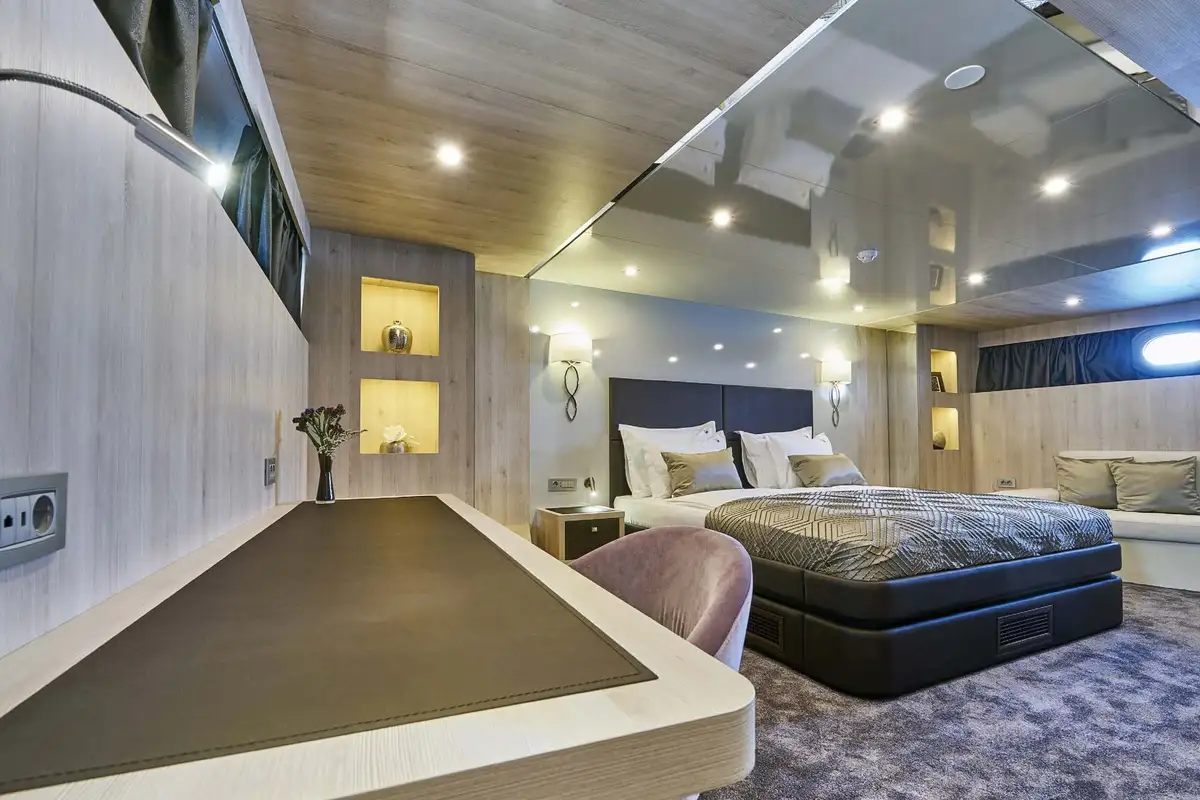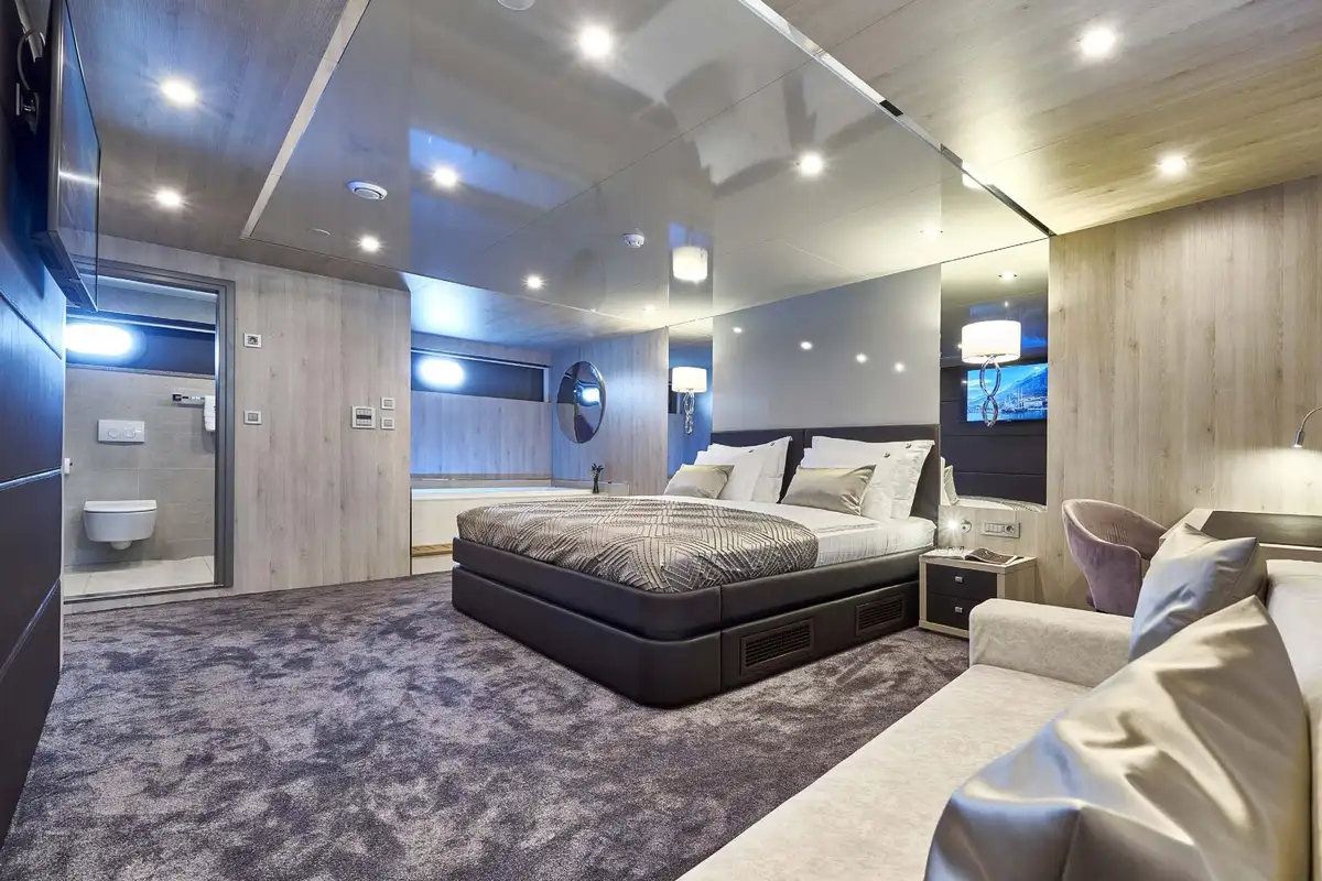 The master suite has a study desk and large sofa on one side of the king size island bed and the en suite bathroom – plus a separate full-size bathtub – on the other. The VIP suite is also a full-beam cabin, almost the same size. The other four cabins are all large doubles with private en suite bathrooms; two of these can convert from doubles to twins.