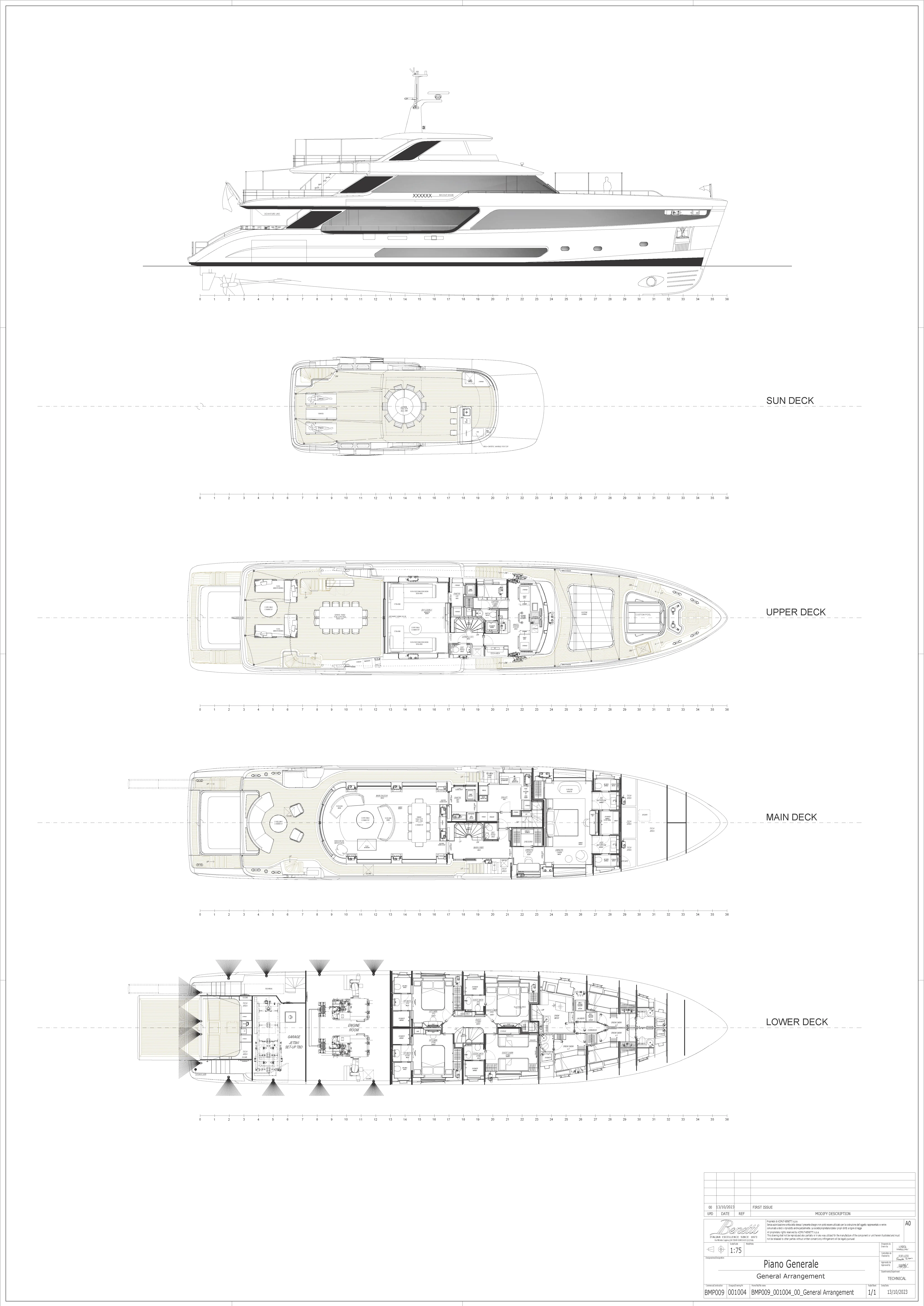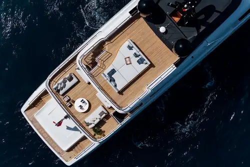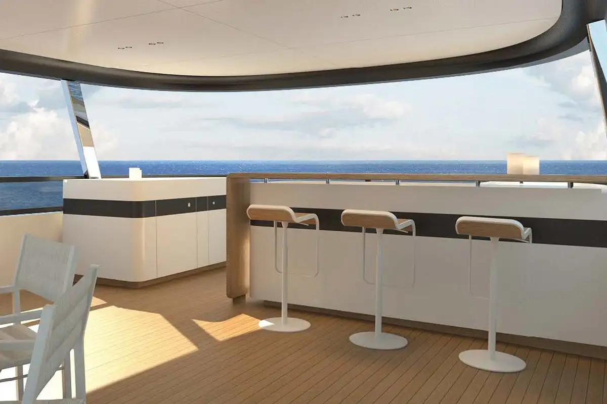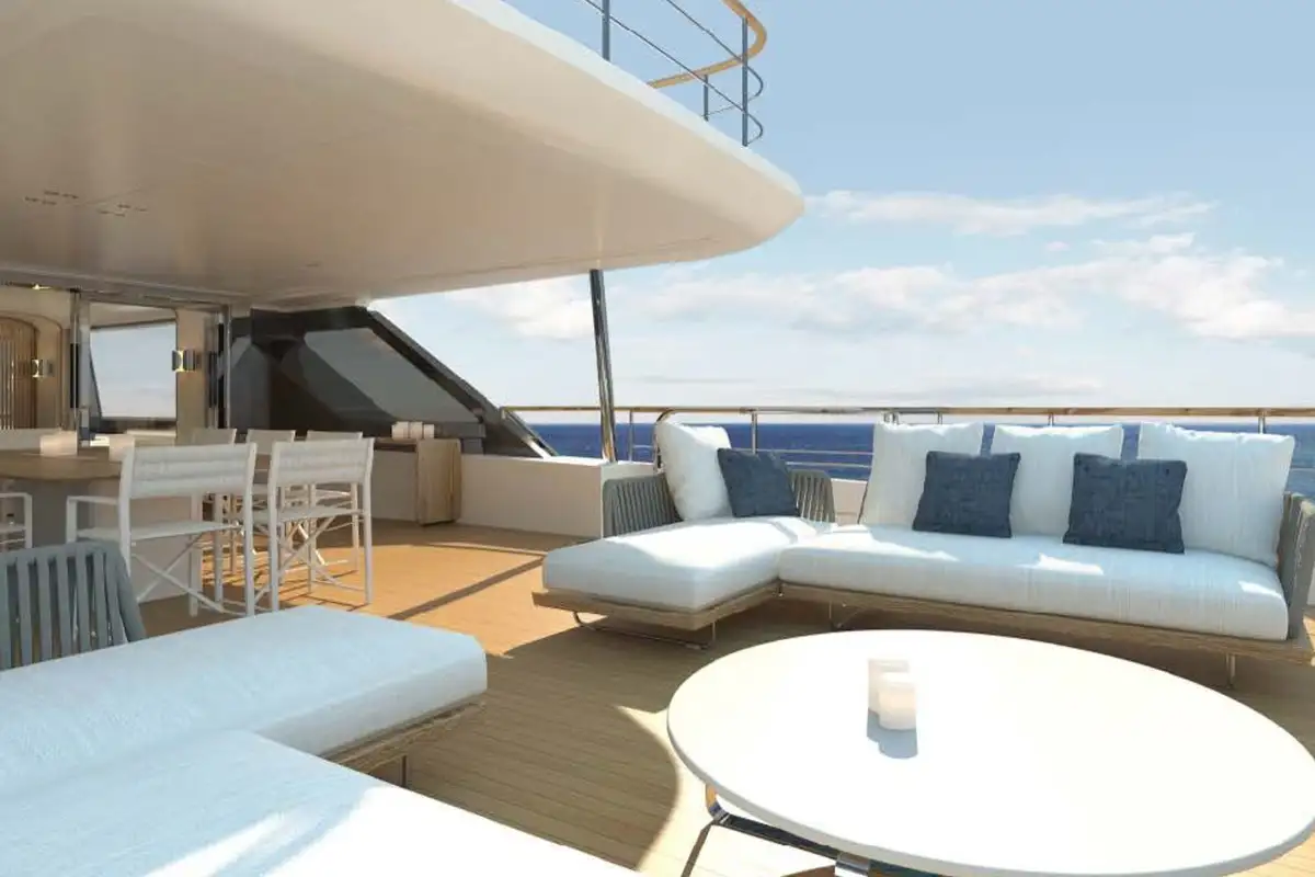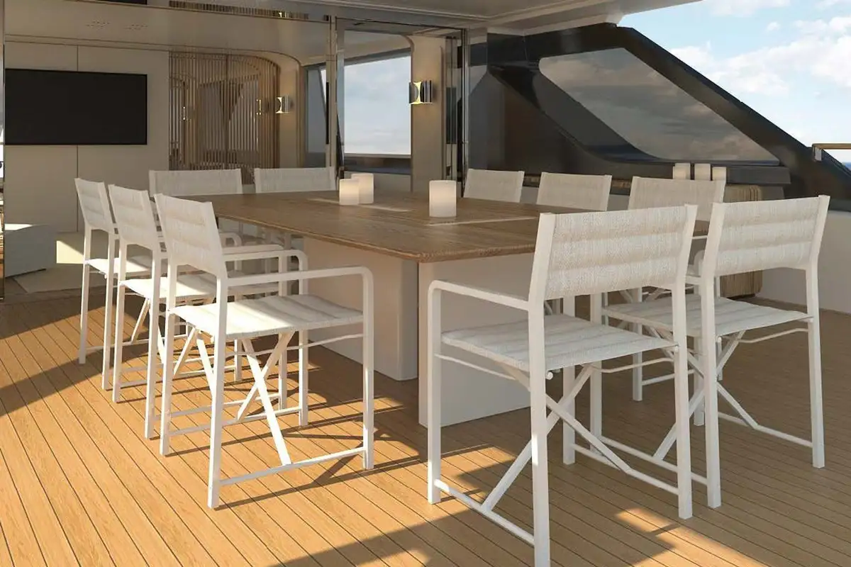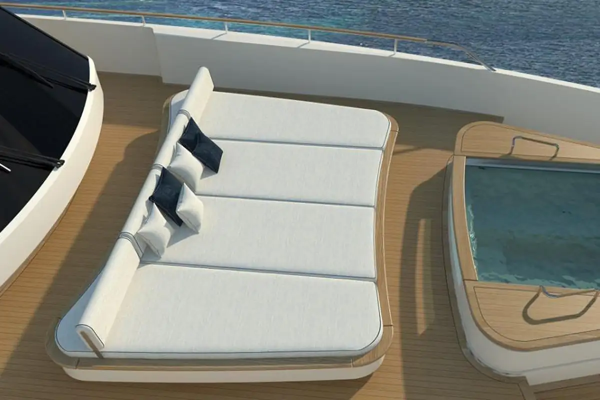 It’s on deck, and the harmonious transitioning from interior to exterior, spaces that DAWO does so well. You can bask in full sunshine, relax with a book in shaded lounge areas, or catch up with conversation in the areas that have both. For lazy days, the foredeck provides a huge single sunpad and a jacuzzi. Those seeking more interaction and socialising can unwind at the wet bar, sun lounger area and al fresco dining area on the sundeck. More comfort is found on the upper deck al fresco lounge area and in the cockpit. There’s also a second al fresco dining area next to the sky lounge on the upper deck.