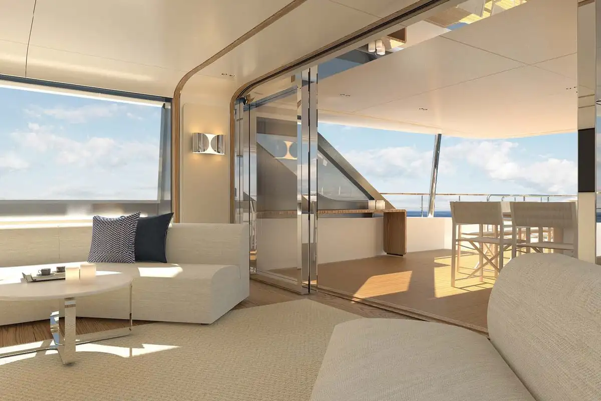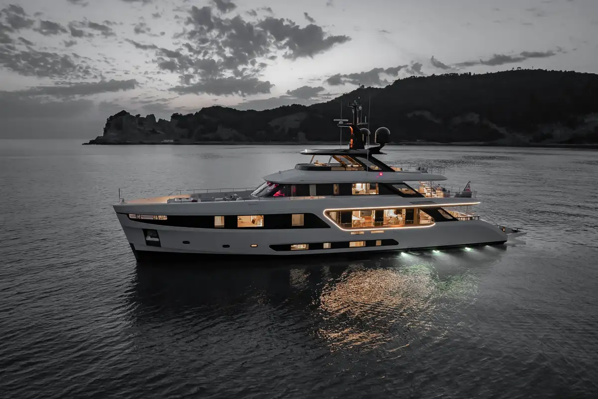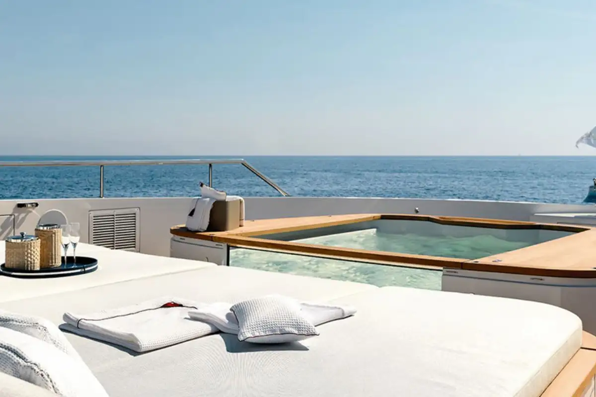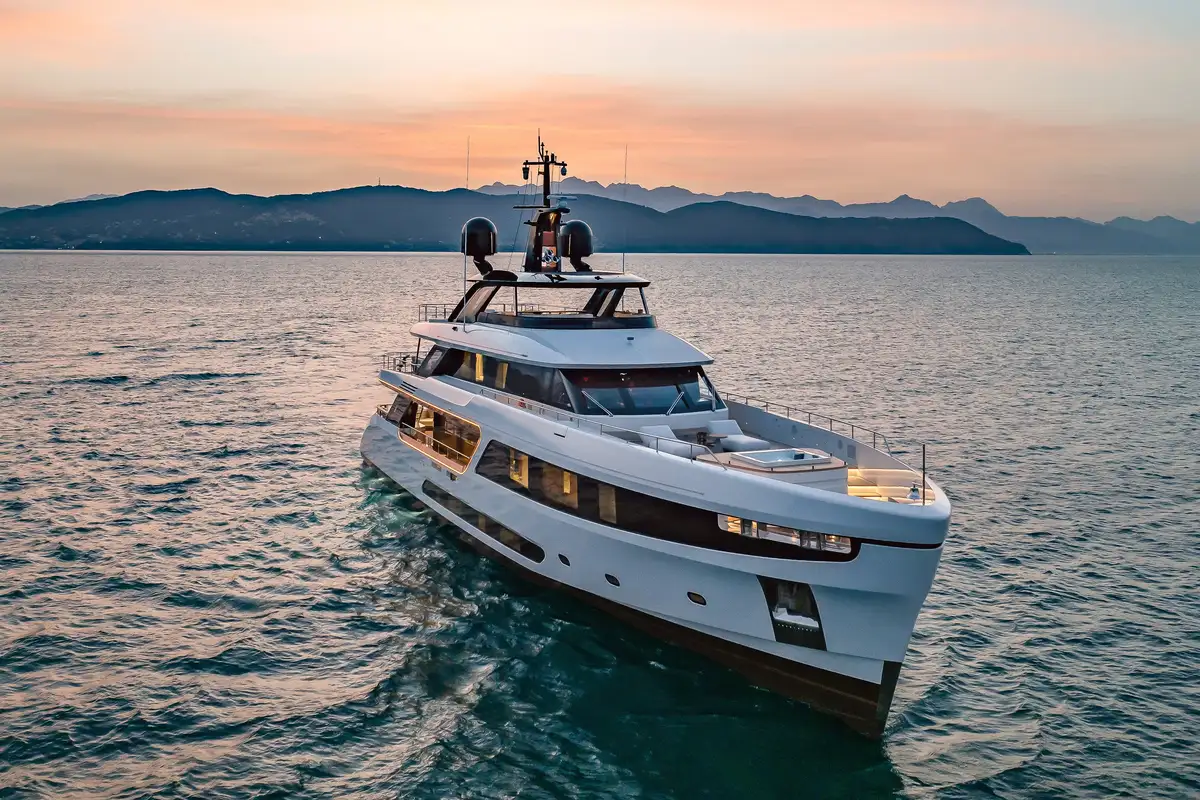Step on board the breathtaking DAWO 37m (121.4ft), where space and chic design blend with glass and light to create a beautiful yacht and an unforgettable charter experience. From the moment you arrive, you’ll be wowed by everything this recently launched yacht offers. From the lounge to the sky lounge to the master suite, large windows allow natural light to flood the interior spaces with sunlight. Her styling of light furnishing and natural materials, mirrors, and glazing complements the curves in the furniture and the cove headlining.