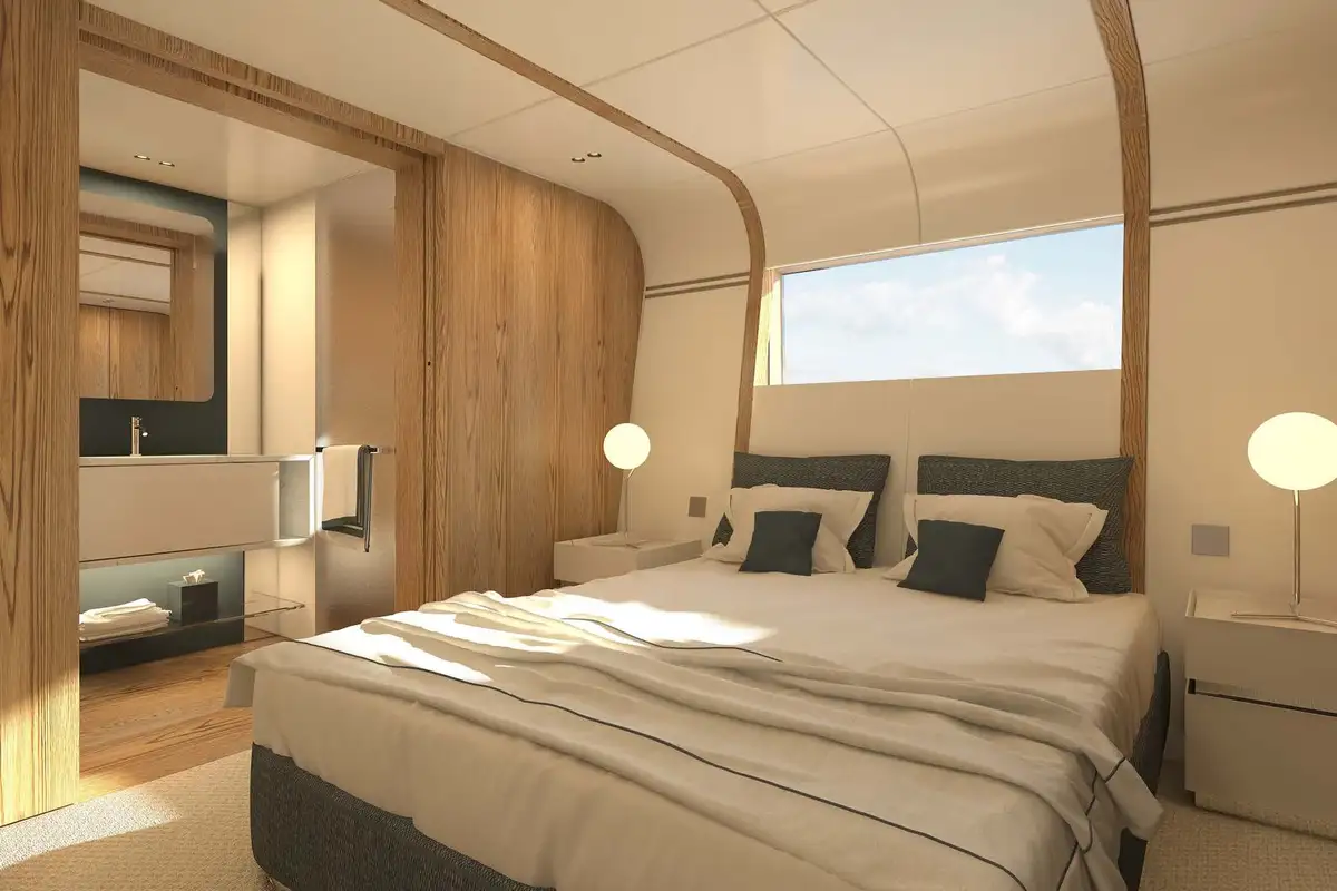 On the lower deck, your guests are treated to similar sanctuaries of comfort. There are two double VIP suites and two double suites; the coved headlining has a uniquely modern and memorable feel, while the large hull windows brighten these beautiful suites.