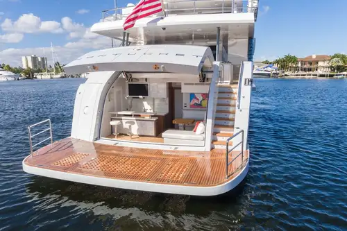 Key features include an extended pilothouse with a sky lounge and office space. The contemporary interior boasts soft neutral tones with pops of color, reflecting the onboard fun factor found on this yacht. A luxurious beach club is a haven for watersports lovers, with a bar, kitchenette, TV, lounge, day head and hydraulic swim platform. DAY ONE comes equipped with a variety of water toys providing fun for all ages. These include SeaDoo Sparks, inflatable paddle boards, inflatable kayaks, snorkel equipment and light fishing gear. The addition, the towed tender tempts exploration around every corner.