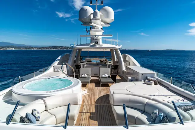 A jacuzzi forms the focal point of the sun deck and is flanked by a large expanse of luxuriant sun pads. Take refuge from the sun under the elegant manta-winged mast arch and enjoy a long, shaded lunch at the open-air dining table or a cool drink at the bar. The relaxing massage waterbed aft - DENIKI's premier attraction – is easily operated at the touch of a button.