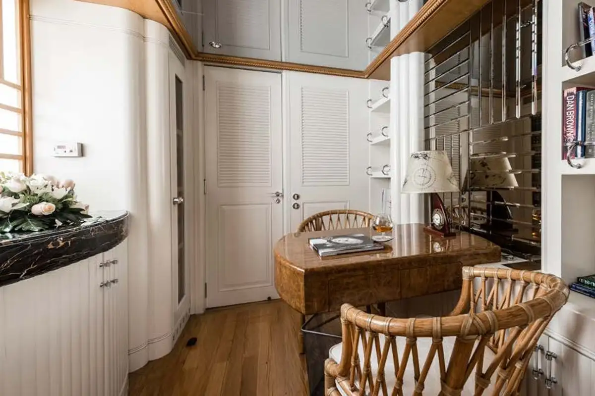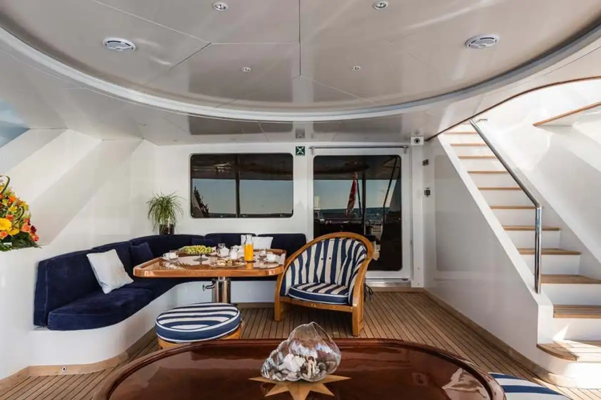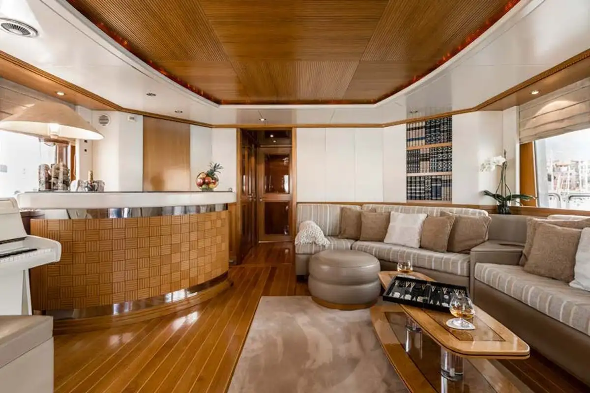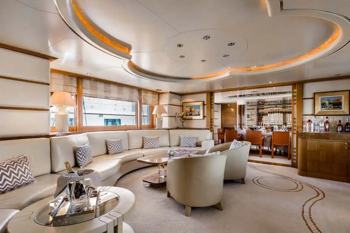 Her finely crafted, traditional interior is an original design by the esteemed yacht designer Terence Disdale with pale fabrics, high-gloss oak panelling and fine marble setting the tone throughout. Her two inside lounges are warm and inviting, elegant and bright. The main deck lounge is a large, sociable living room with a separate dining room forward, and the sky lounge above it is a cocktail lounge.