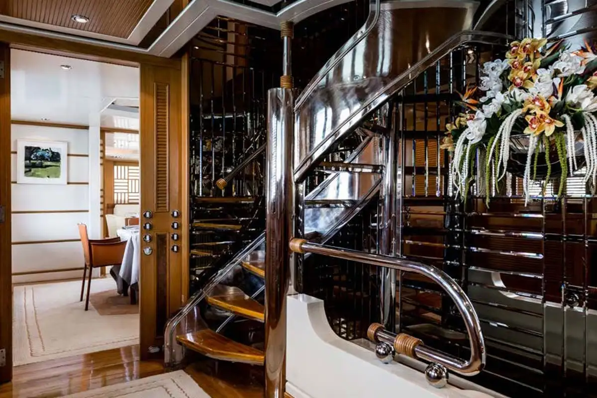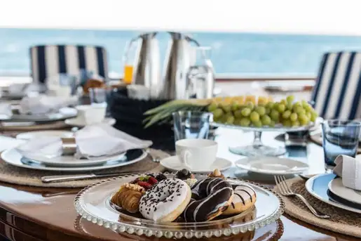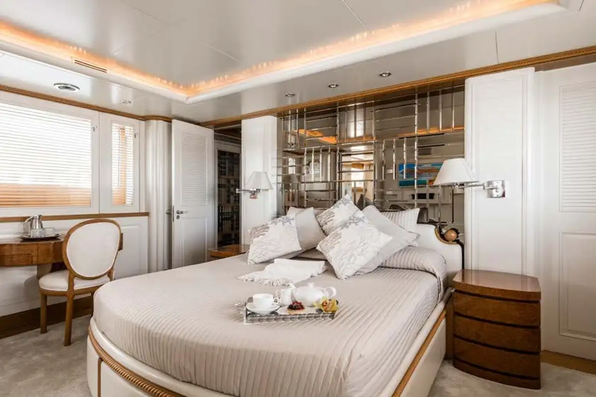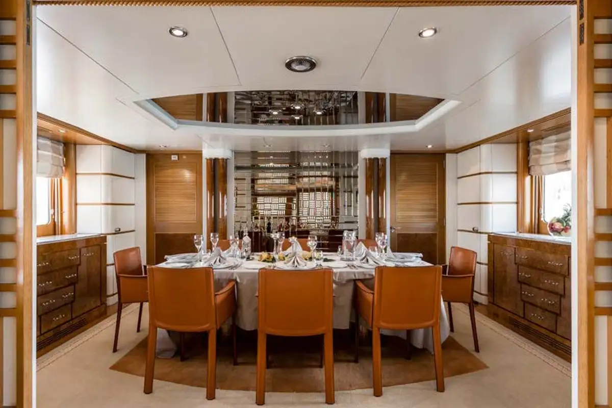 Her finely crafted, traditional interior is an original design by the esteemed yacht designer Terence Disdale with pale fabrics, high-gloss oak panelling and fine marble setting the tone throughout. Her two inside lounges are warm and inviting, elegant and bright. The main deck lounge is a large, sociable living room with a separate dining room forward, and the sky lounge above it is a cocktail lounge.