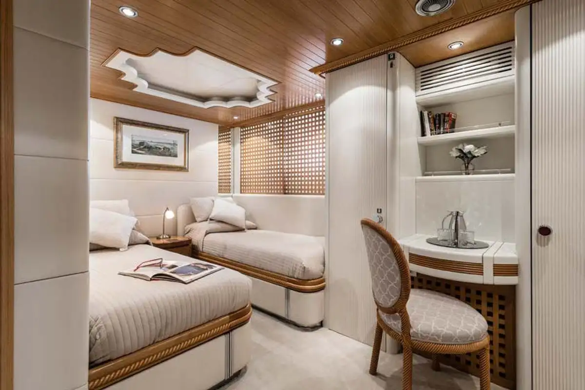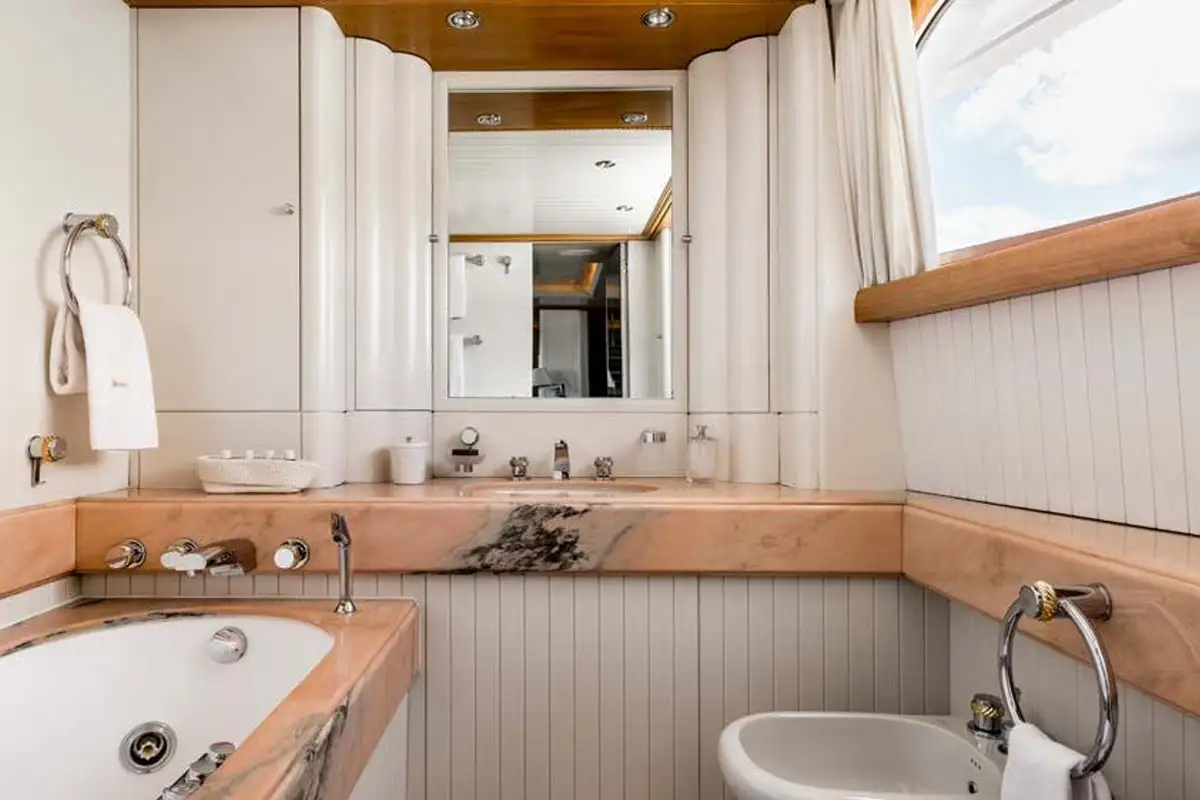 Up forward on the main deck, the master suite is a beautifully finished full-beam cabin with an abundance of natural light and two separate his-and-hers bathrooms en suite. The other guest cabins, all on the lower deck, include two large doubles and two twins, one of which has an extra pullman bunk.