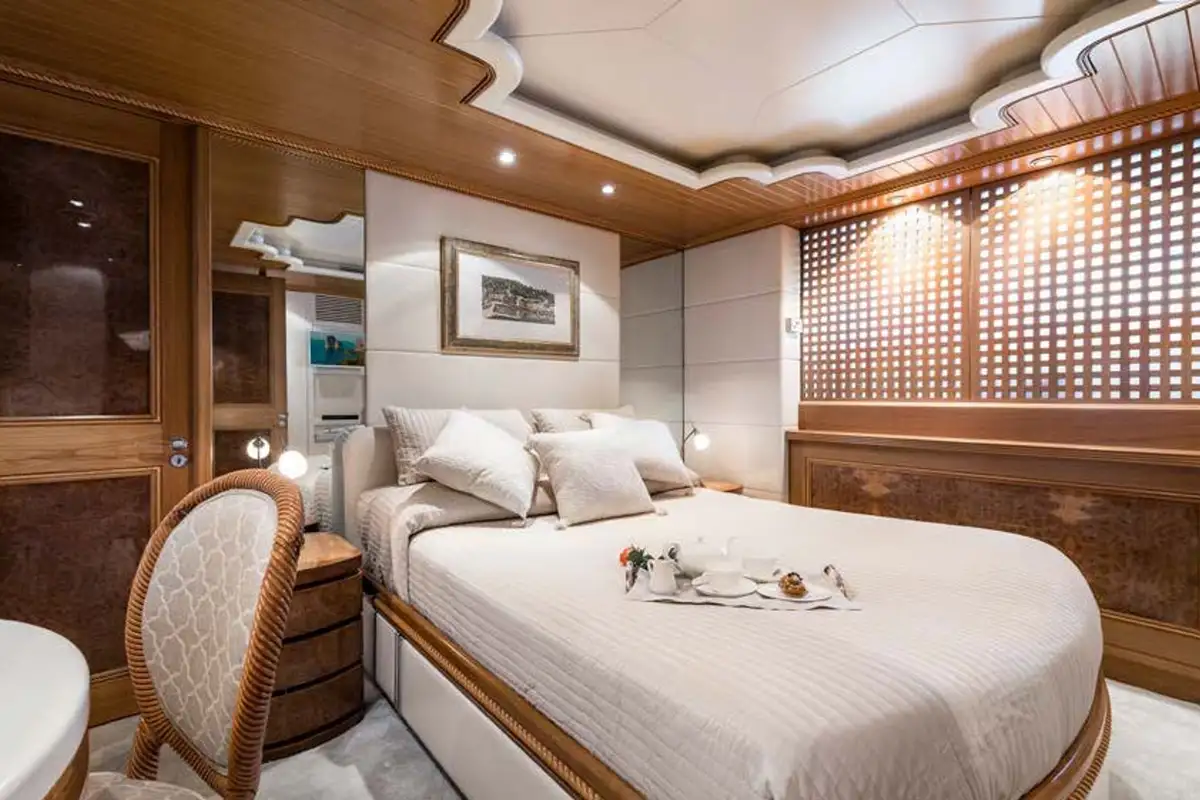 A spacious tri-deck vessel, she offers ample living space inside and out for 10 or 11 guests, with a five-cabin layout. With an enthusiastic and experienced crew of eight on board, attentive service at all times is assured. Despite her classic looks, she is fitted with state-of-the-art stabilisers to smooth her motion when she’s anchored and also when she’s cruising at sea.