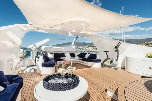 The upper aft deck is a superb outdoor dining area with a 12-seat oval dining table and there’s a twin-table lounge plus a sunbathing area on the main deck aft. Up on the sundeck there’s a jacuzzi pool, a large expanse of sunpads and a relaxing cocktail lounge.