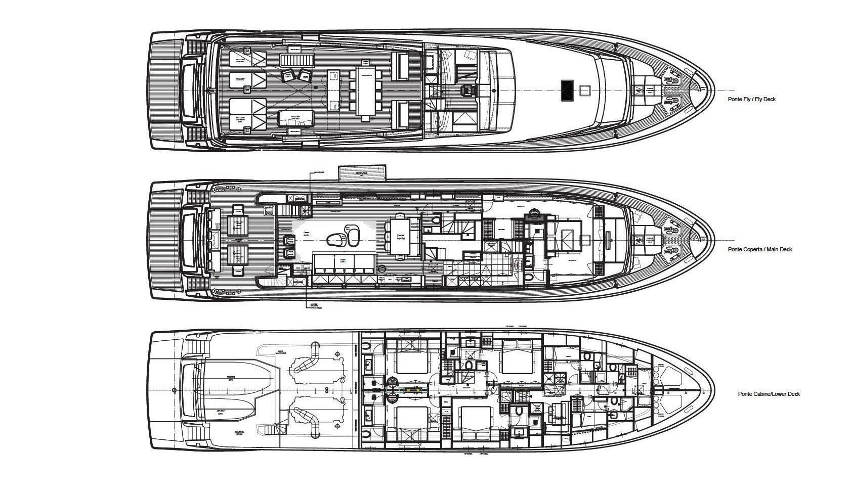 A port staircase leads to the upper deck, where a double sunpad can be found to the stern with a sofa/sunpad to port and starboard. A canvas shade can be placed above which also covers the sofa and cushions amidships. A wet bar and alfresco dining table to seat 10 are placed beneath the hardtop.