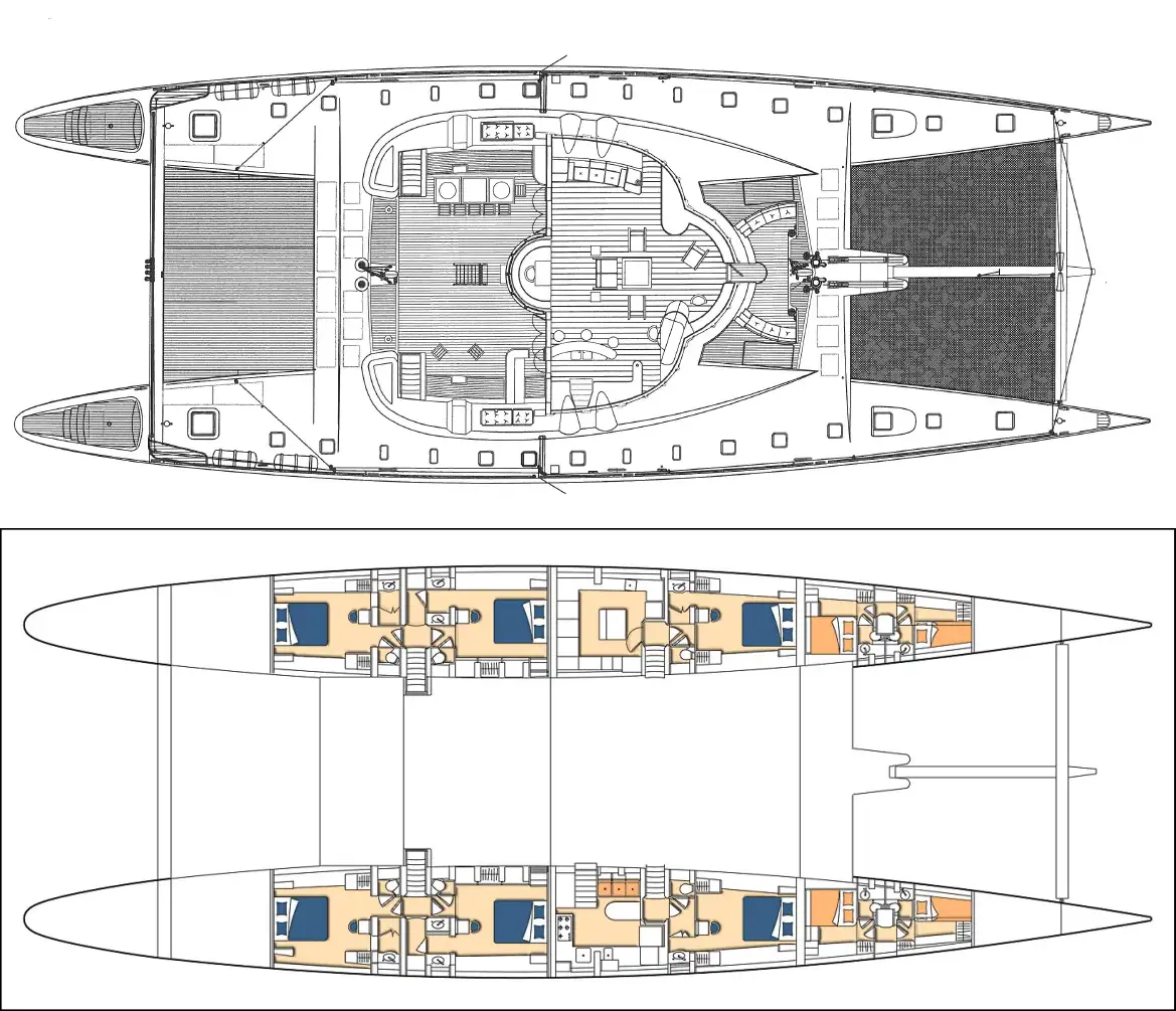 This catamaran schooner – the largest in the world – offers a perfectly stable platform for your charter and the sort of guest deck spaces you would expect to find on a much larger motor yacht. Add to that a draft of just 3m (9.2ft), which allows you to explore the picture-postcard lagoons and anchorages out of bounds to motor yachts.