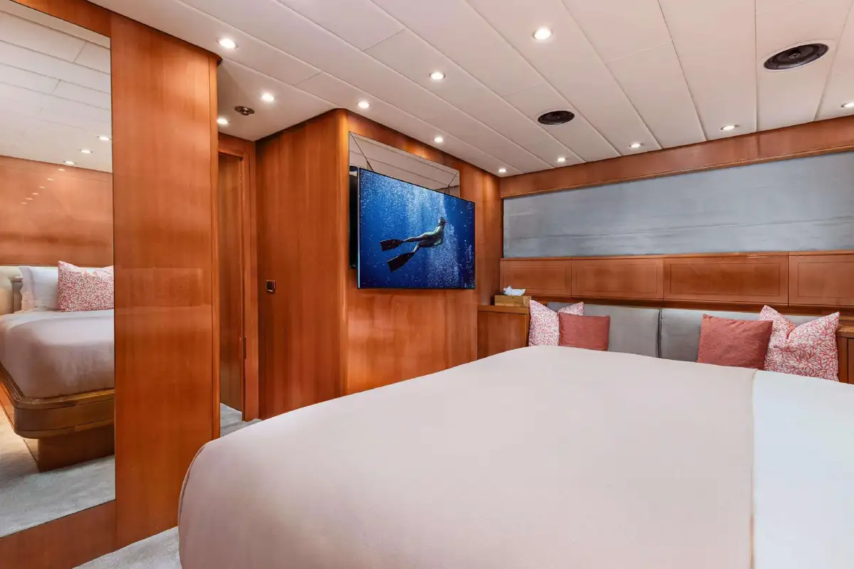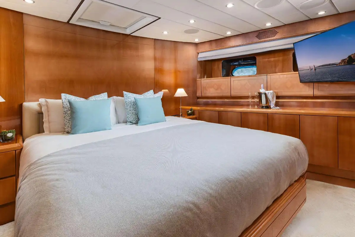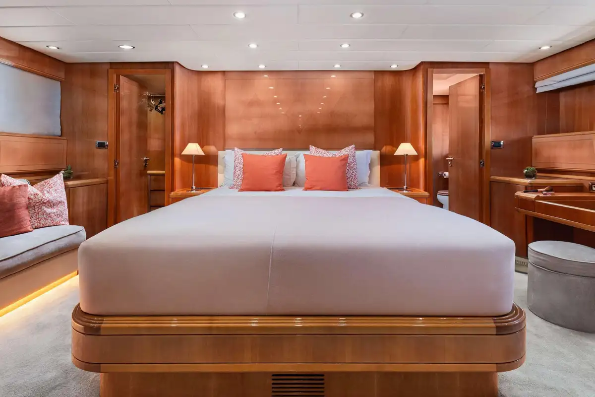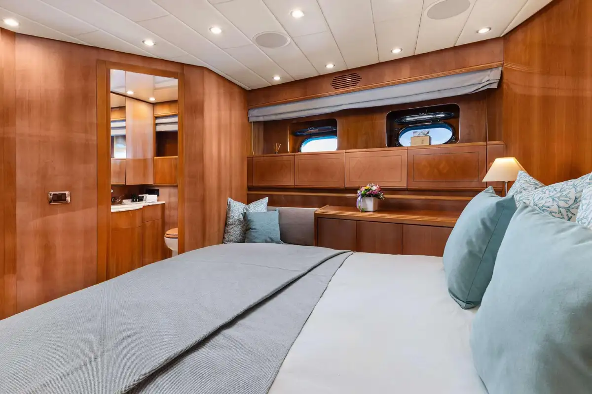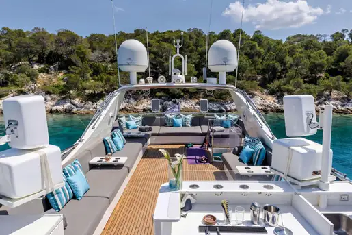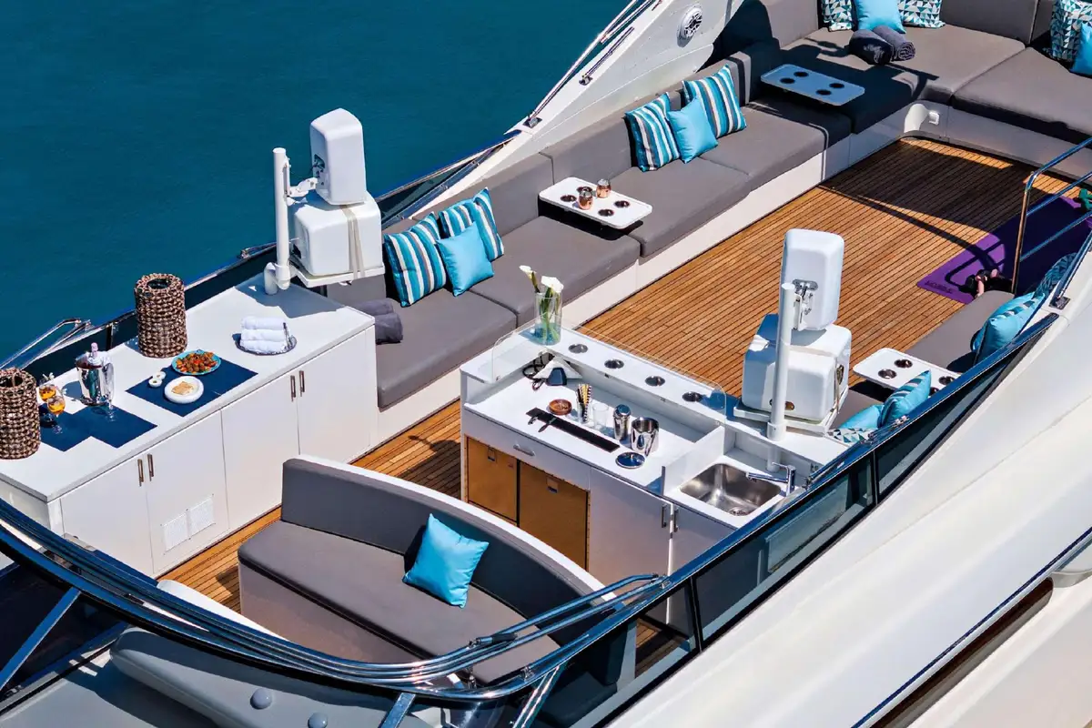The flybridge is the main open-air social space on board with a commending view over the sea. Up here you’ll find a bar and a large expanse of comfy lounge seating and day beds, a proper sound system for a party and plenty of open deck space for to dance as the sun goes down.