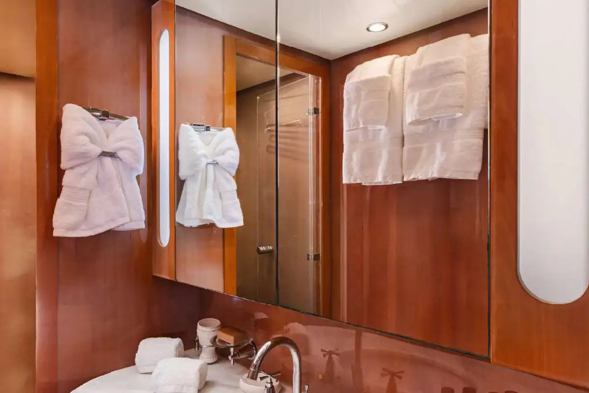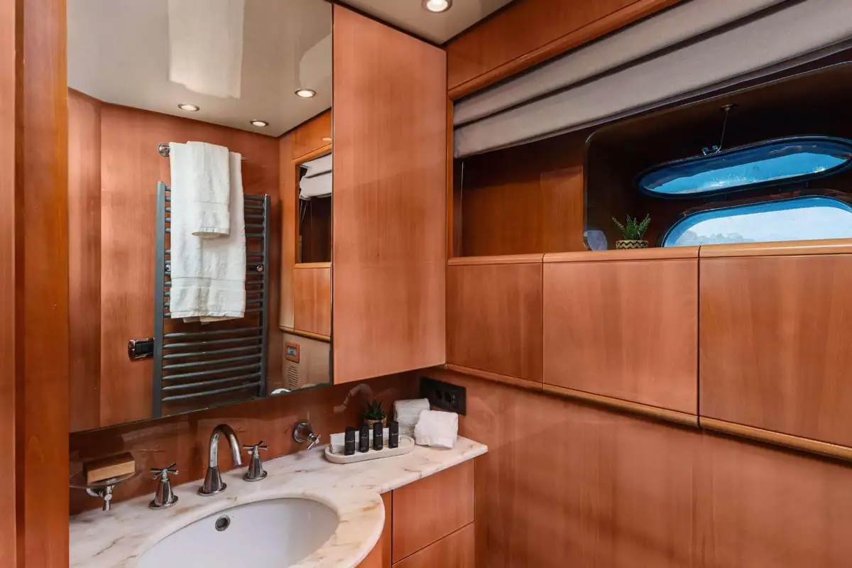 All four guest cabins are on the lower deck, with access via a staircase from the lounge. The master suite is a full-beam cabin, located aft, with a sofa on one side of the king size island bed, a desk on the other side and a walk-in closet. There’s another full-beam cabin up forward – a VIP double with a settee – plus a standard double and a twin-bed cabin with an extra pullman bunk. All guest cabins have their own private en suite bathrooms.