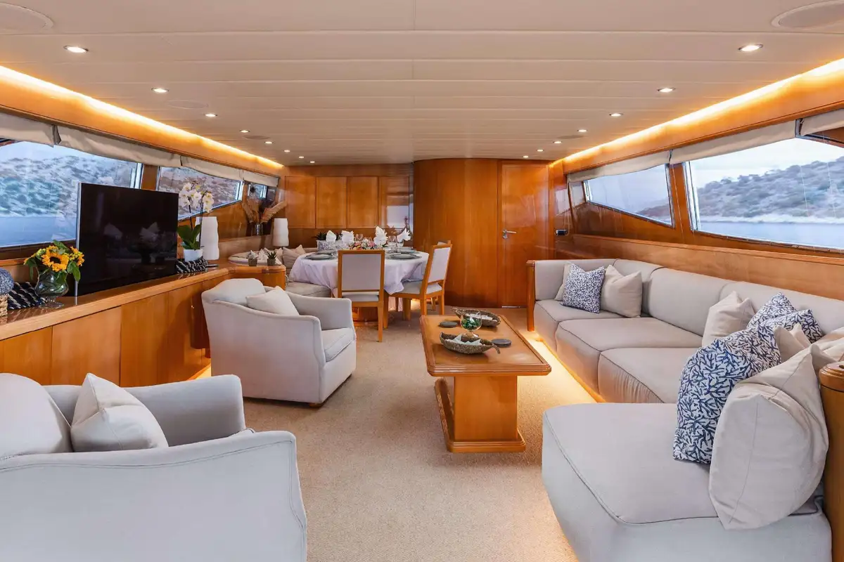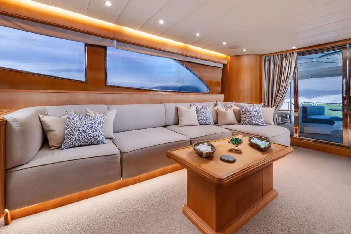 Full-beam sliding glass is all that separate the main deck aft from the spacious lounge. When the doors are open wide, groups of guests outside and inside can feel connected and converse with ease. The lounge has an inviting, smart casual vibe with a sociable lounge area aft and a round dining table up forward.