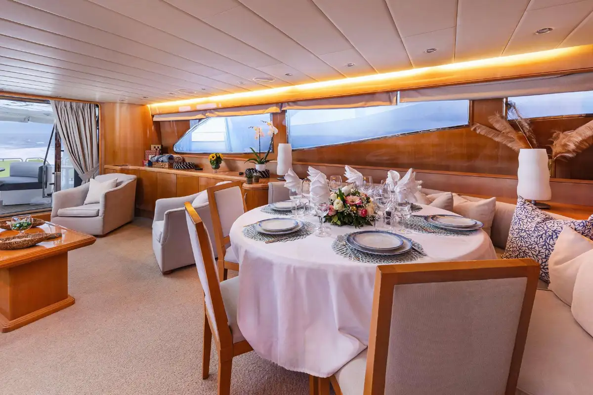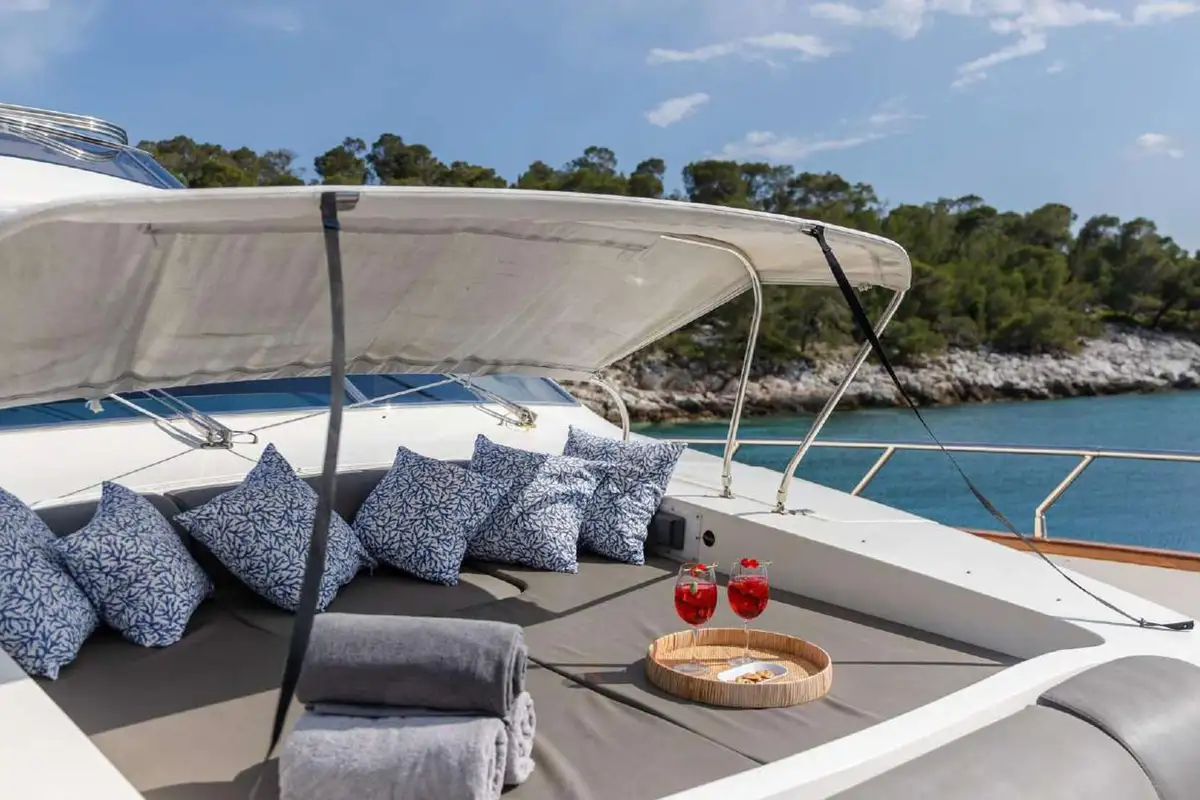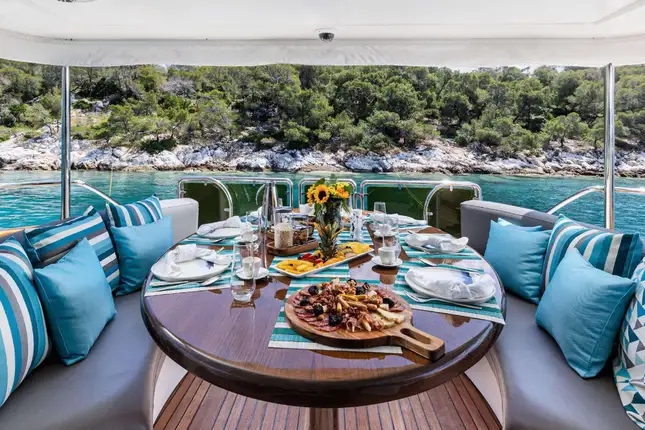 The main deck aft is a cosy outside space with ample shade where your whole group can enjoy brunch, fine dining or simply chat across the big round table with sweeping views of the sea. There’s also a breezy foredeck lounge with seats, sunpad cushions and a bimini when shade is required.