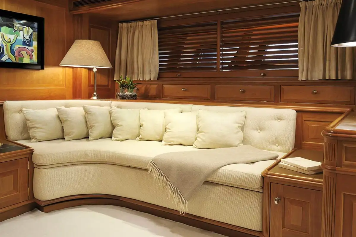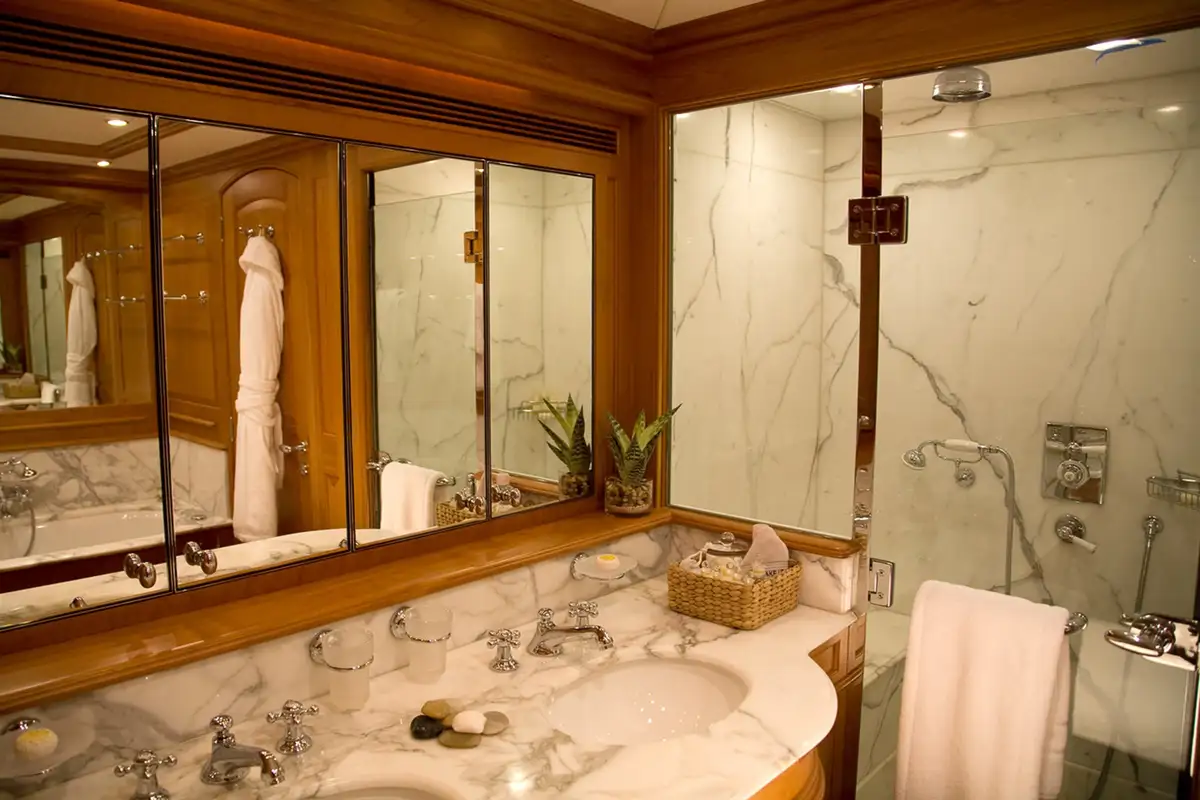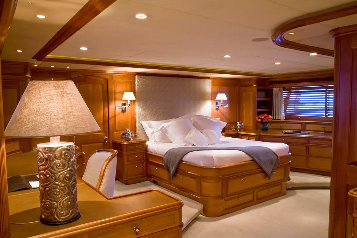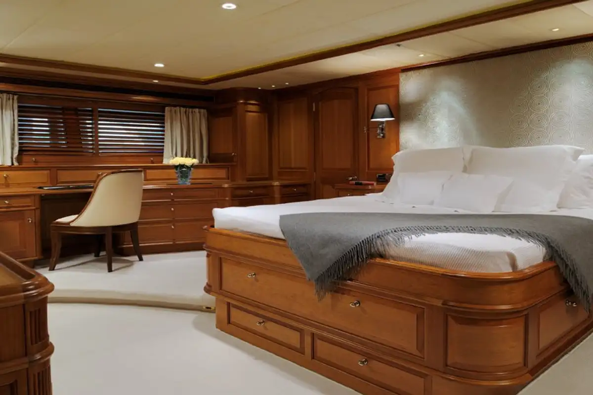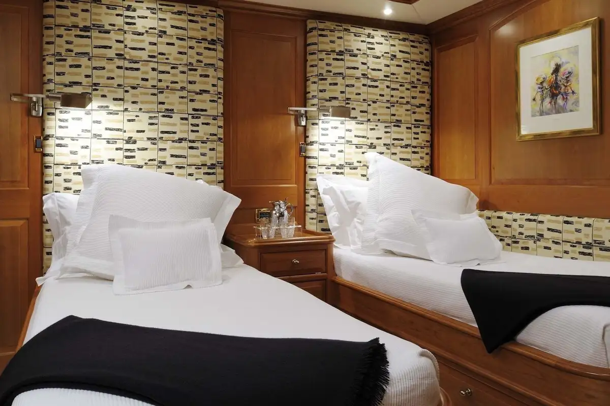 After several refits since her launch in 2002, DRUMBEAT is lovingly maintained and her most recent 2019 shipyard period included the addition of new upholstery throughout. She is traditional but light and elegant in her simplicity. Her 53m (173.8ft) length and 10.4m (34.1ft) beam allow for an extremely spacious full beam master suite with king sized bed and en suite with jacuzzi bath and shower. You also benefit from a walk-in wardrobe with generous storage, separate seating area and desk. Your guests can choose between the two identical double cabins with seating area or the two good sized twin cabins - one with an additional pullman berth for a child.