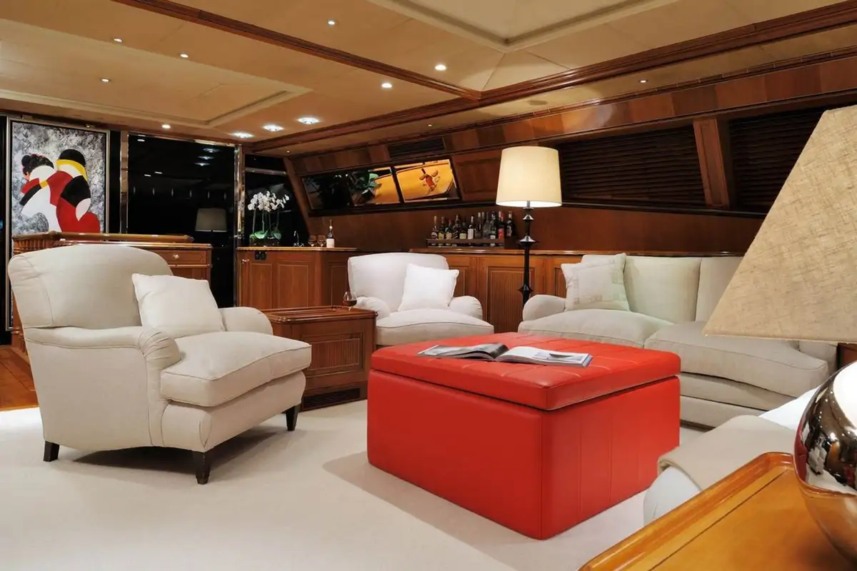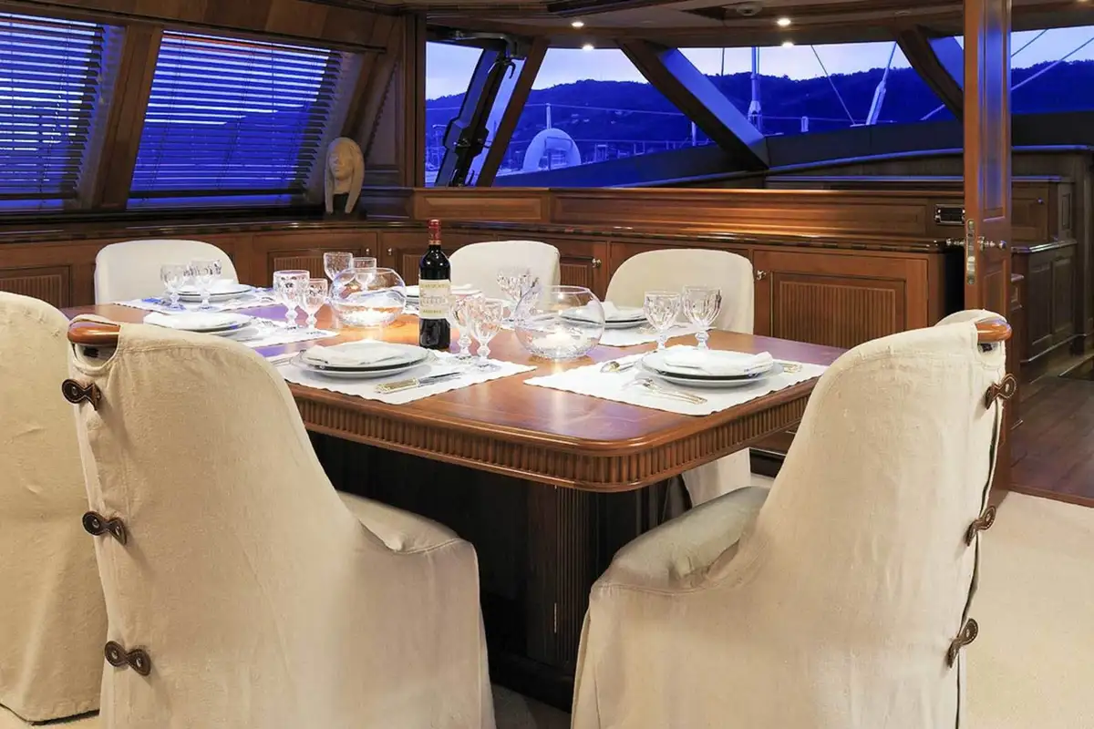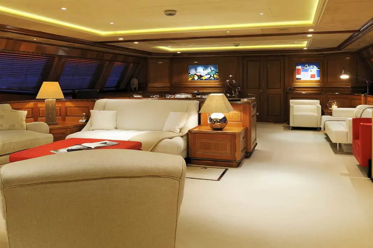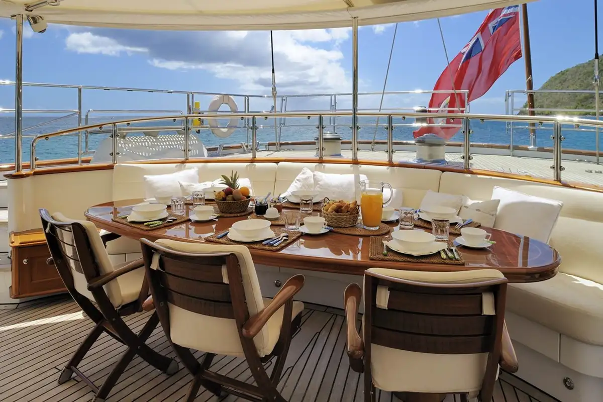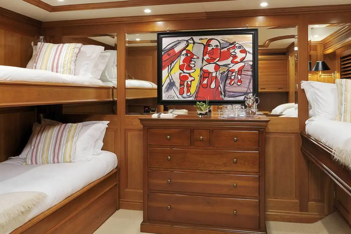 After several refits since her launch in 2002, DRUMBEAT is lovingly maintained and her most recent 2019 shipyard period included the addition of new upholstery throughout. She is traditional but light and elegant in her simplicity. Her 53m (173.8ft) length and 10.4m (34.1ft) beam allow for an extremely spacious full beam master suite with king sized bed and en suite with jacuzzi bath and shower. You also benefit from a walk-in wardrobe with generous storage, separate seating area and desk. Your guests can choose between the two identical double cabins with seating area or the two good sized twin cabins - one with an additional pullman berth for a child.