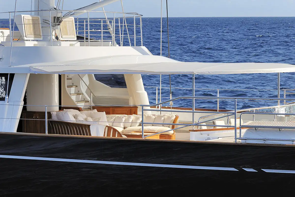The feeling of space and freedom on DRUMBEAT is largely thanks to her one-level layout from the cockpit through to the lounge, dining area and wheelhouse forward. All is one continuous living area with a partially shaded al fresco dining area on the aft deck. As an alterative, the flybridge offers another area for relaxing in the sun or dining with panoramic ocean views.