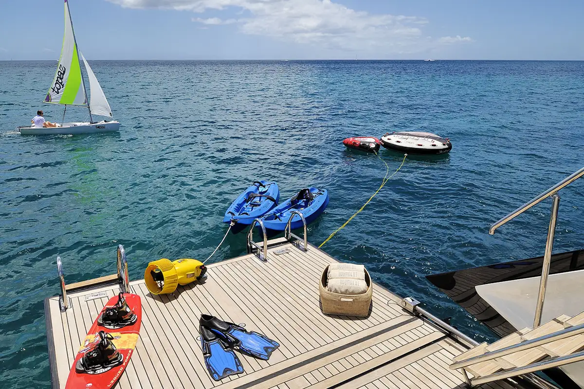 Unusual for most sailing yachts, guests have access to the Castoldi jet tender with full weather protection and the crew can use the second fast tender for the watertoy tow action! There are waterskis, wakeboard, inflatable doughnut tow, sea scooters and plenty of diving and fishing gear to keep all the family amused and all can be easily accessed via the oversized swim platform.