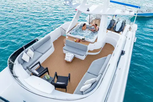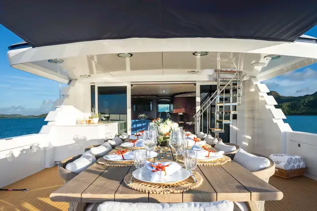 Arriving in the main deck cockpit, you’ll notice it’s designed as a relaxed gathering space. It offers al fresco seating with tables – an ideal setting for a leisurely breakfast or a quiet planning session for the day’s adventures.