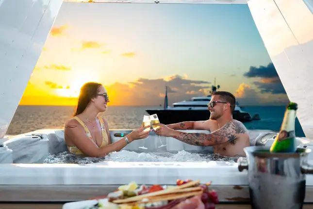 The sundeck is perfect for soaking up the rays while taking in expansive views of the horizon. A central raised jacuzzi and social seating invite intimate conversation or solitary contemplation.EALU has an impressive range of water sports equipment for those seeking excitement. Enjoy swift transfers in the 9.8m (32ft) Boston Whaler, or opt for the thrill of an eFoil board, two Sea-Bob, two SUPs, two jetskis, and two kayaks. Take the water slide from the upper deck to the sea, snorkel, or try out the collection of towable inflatables; on EALU, adventure is always at hand.