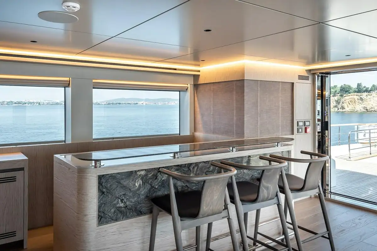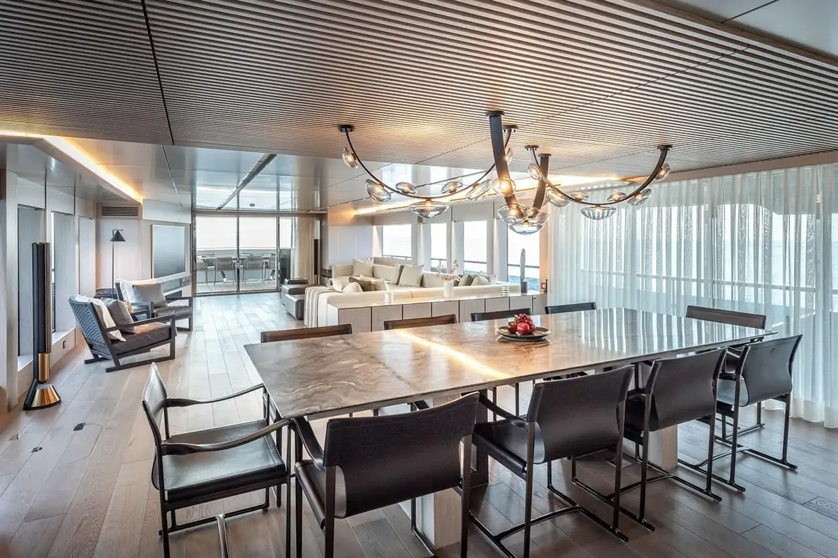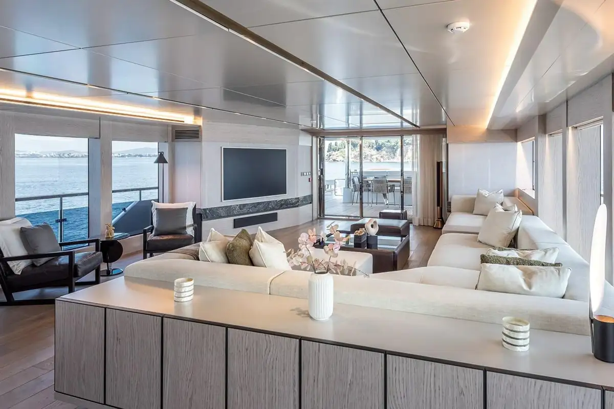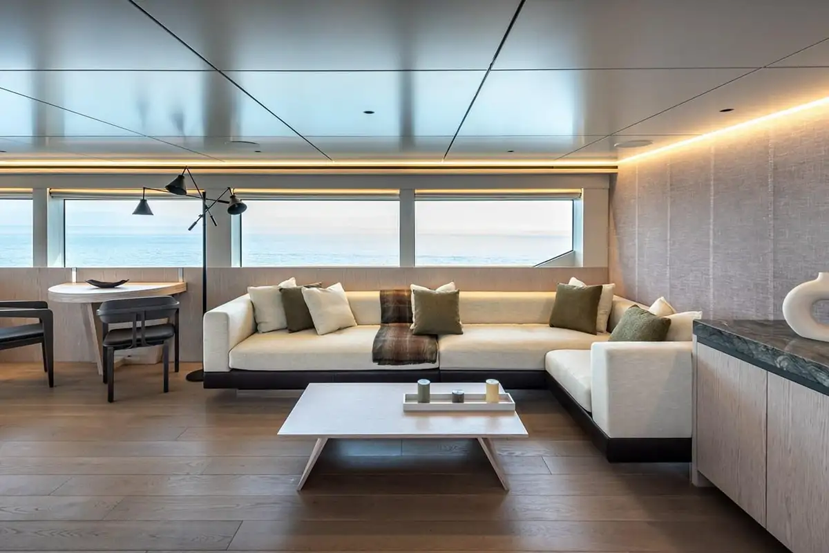 Step inside and you’re in a chic, clean and soothing environment with high-speed wi-fi internet connectivity and air conditioning throughout all three levels. The main deck lounge is vast, with superb sea views through floor-to-ceiling glass on three sides, and sofas for a full party of 12 guests facing the 100-inch smart TV. Further forward is a 10-seat formal dining table.