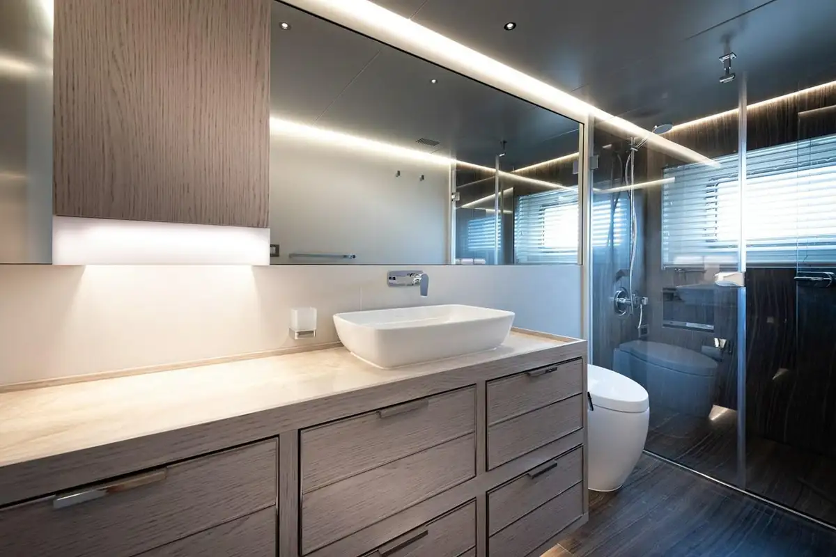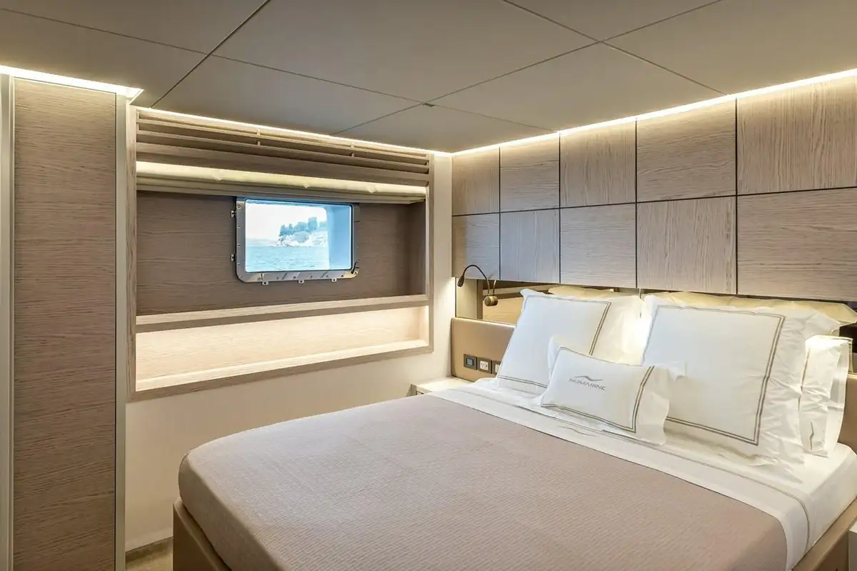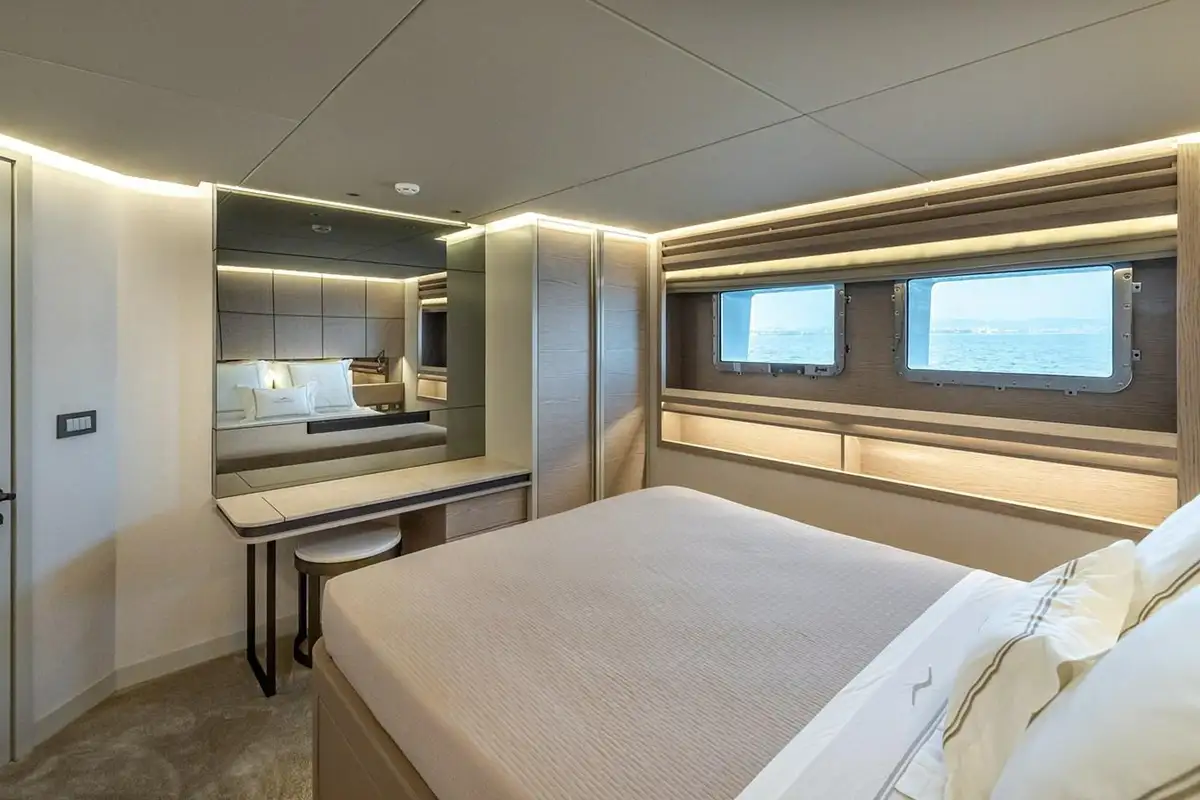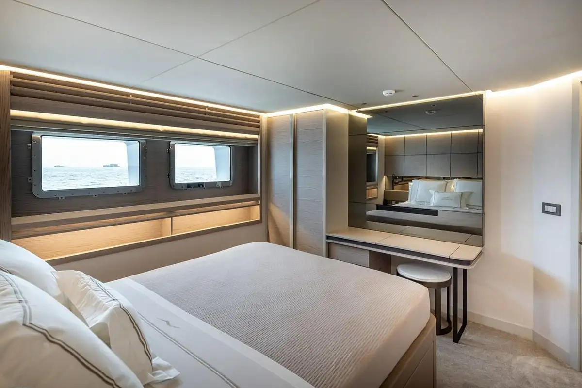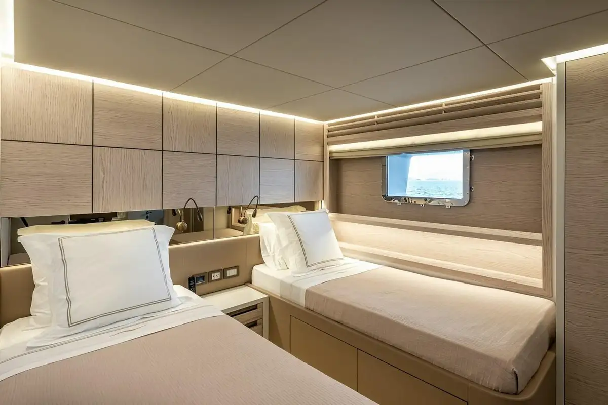 The master cabin has a king size bed on the centreline, a desk with a fabulous sea view and a bathtub plus a separate rain room shower in its en suite bathroom. The lower deck guest cabins are finished in a similar neutral palette and clean, modern style.