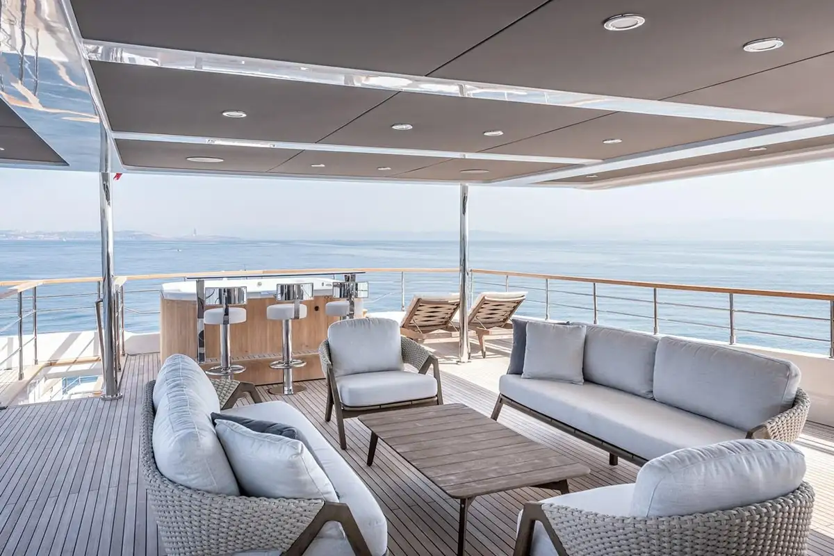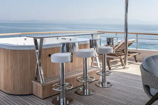There’s a spacious open-air lounge on her foredeck with day beds and forward-facing seats. The sundeck is huge and mostly shaded with a big hardtop above the lounge and dining areas. Further aft is a bar and a jacuzzi pool in full sun. One level down, the upper aft deck offers a wide open space for entertaining or dancing when she isn’t carrying one of her tenders up there, en route to your next destination. The main deck aft, meanwhile, is a shaded, sheltered lounge/dining area with sunpad cushions aft, and there’s a beach club in her fold-out stern.